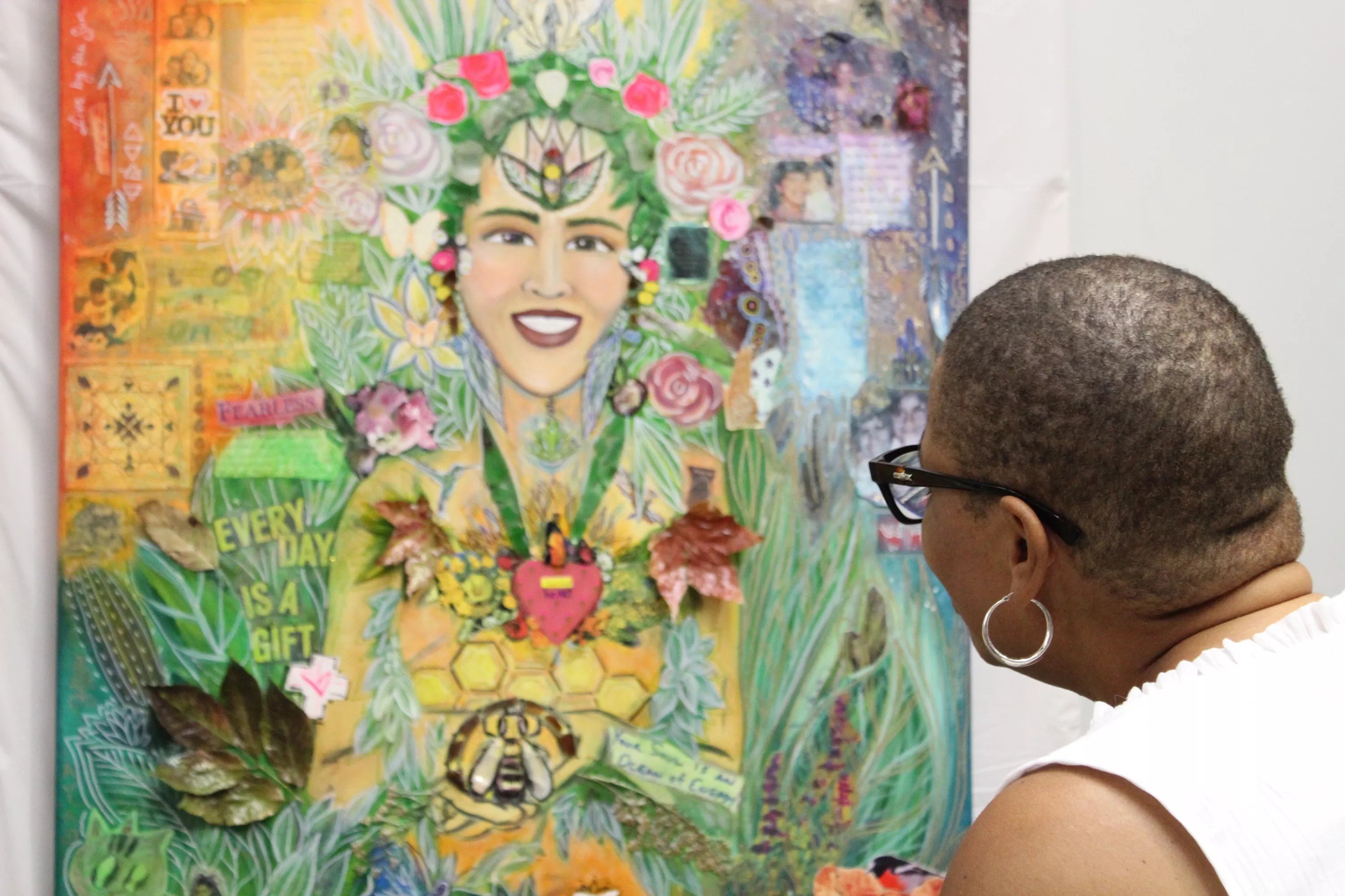 A guest views a painting at the BGBG Collective second annual Queens Rise Art Walk at the Nina Pulliam Rio Salado Audubon Center on October 8, 2022.