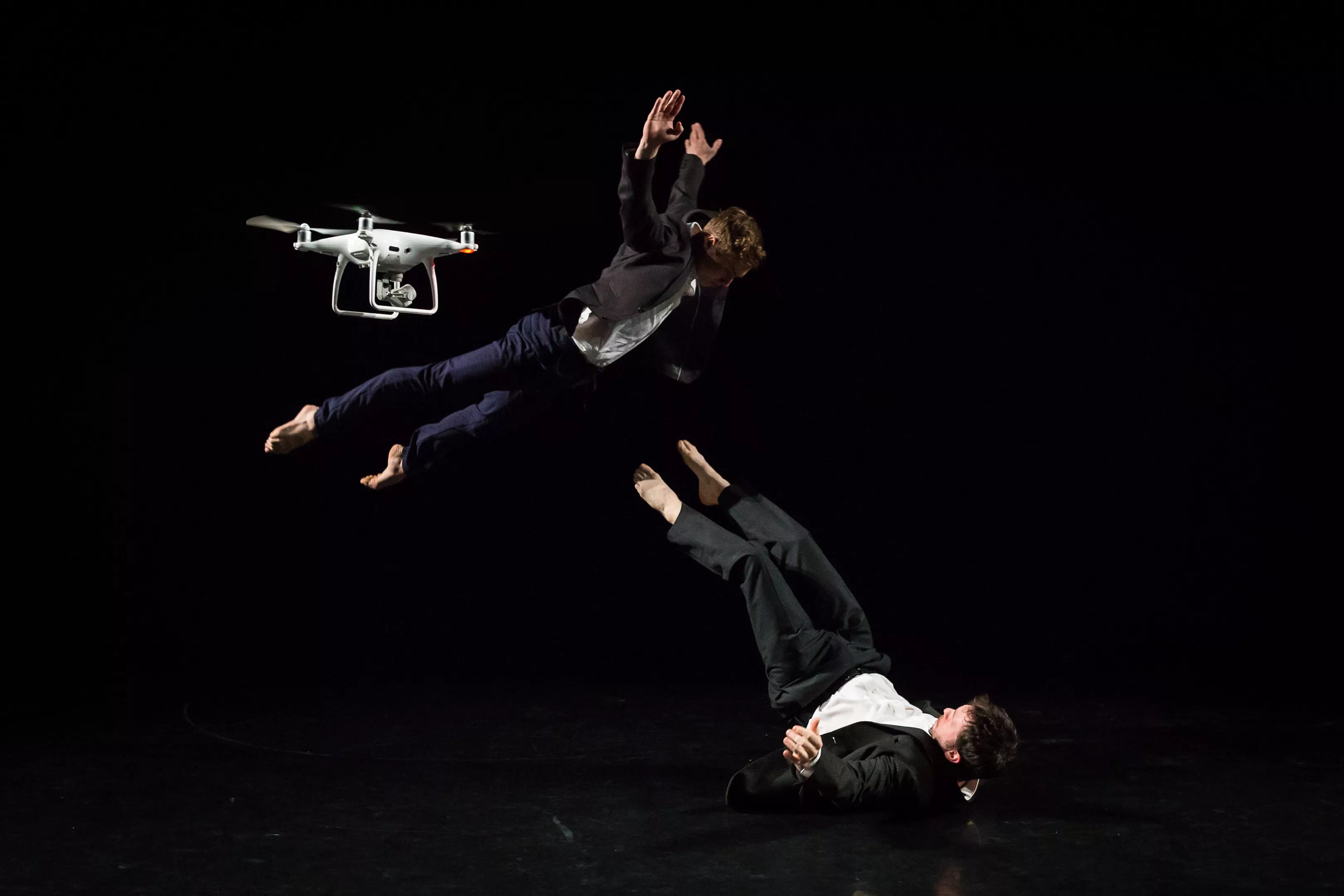 Saturday’s program included NobleMotion Dance’s Drone, in which a drone hovers over the stage, its loud hum permeating the darkness that envelops the dancers. Their movements reflect the ways technology intrudes on privacy while modifying thinking, emotion, and behavior.
