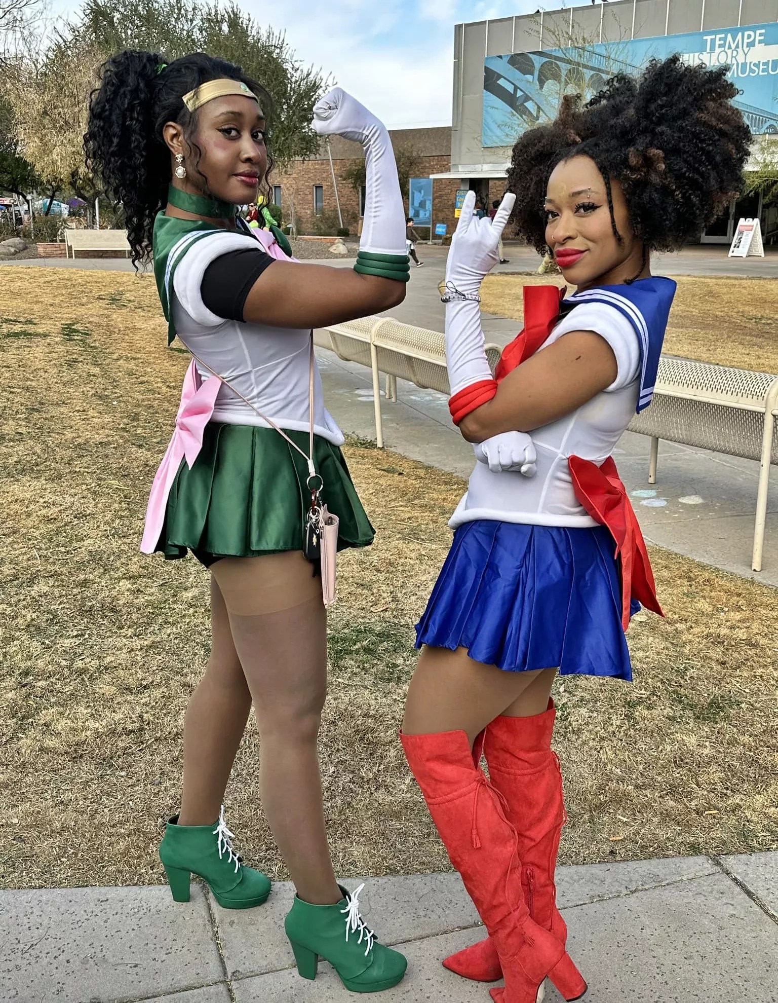 Cosplayers portraying Jupiter Moon, left, and Sailor Moon.