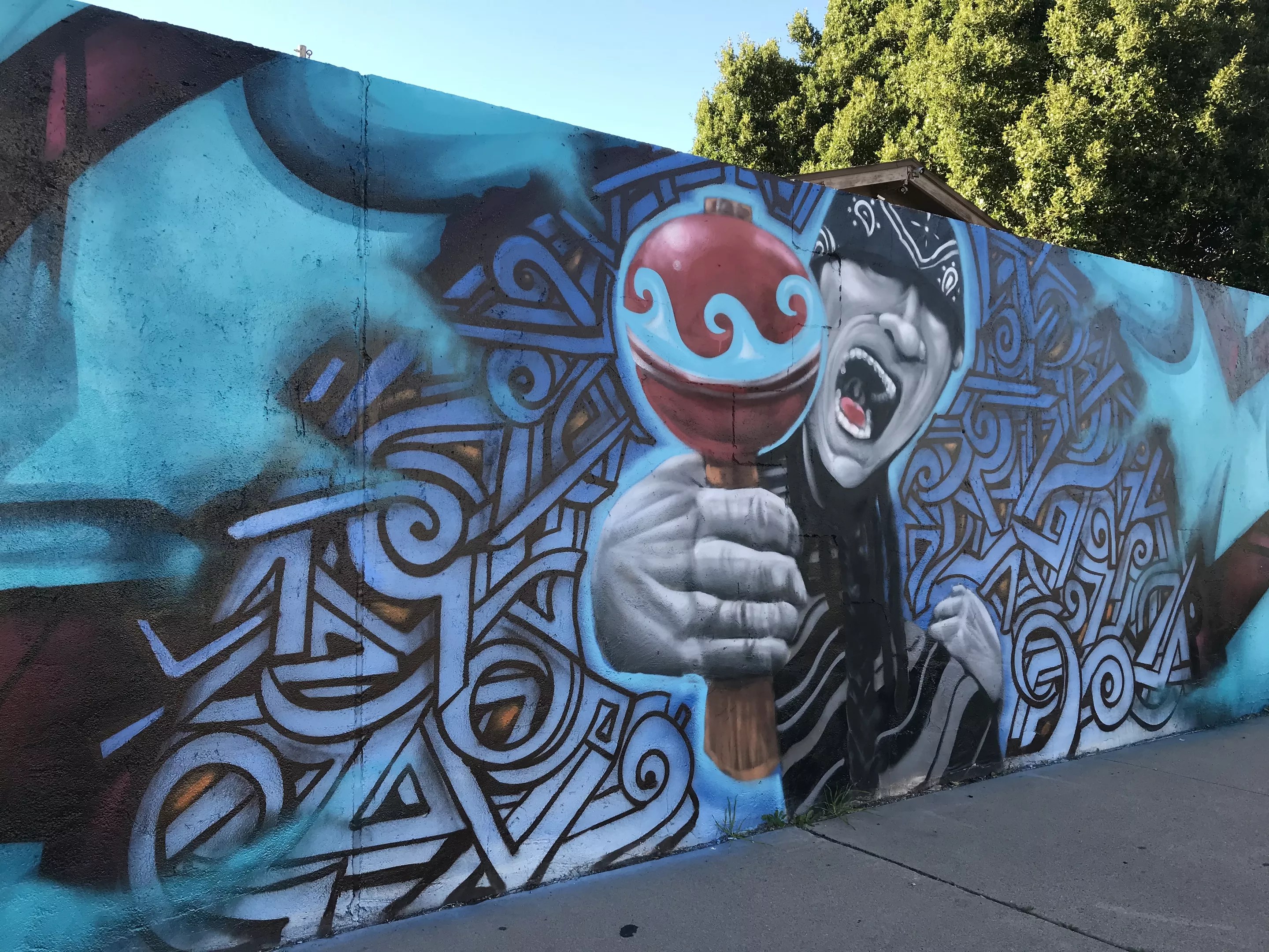 A trio of indigenous artists with distinctive styles painted this mural located in Mesa. The piece reflects the Native identity of the Salt River and Gila River communities. The mural, located on Cherry Street south of University Drive, includes both abstract designs and figurative work. The line work by Thomas “Breeze” Marcus reflects elaborate basketry designs.
