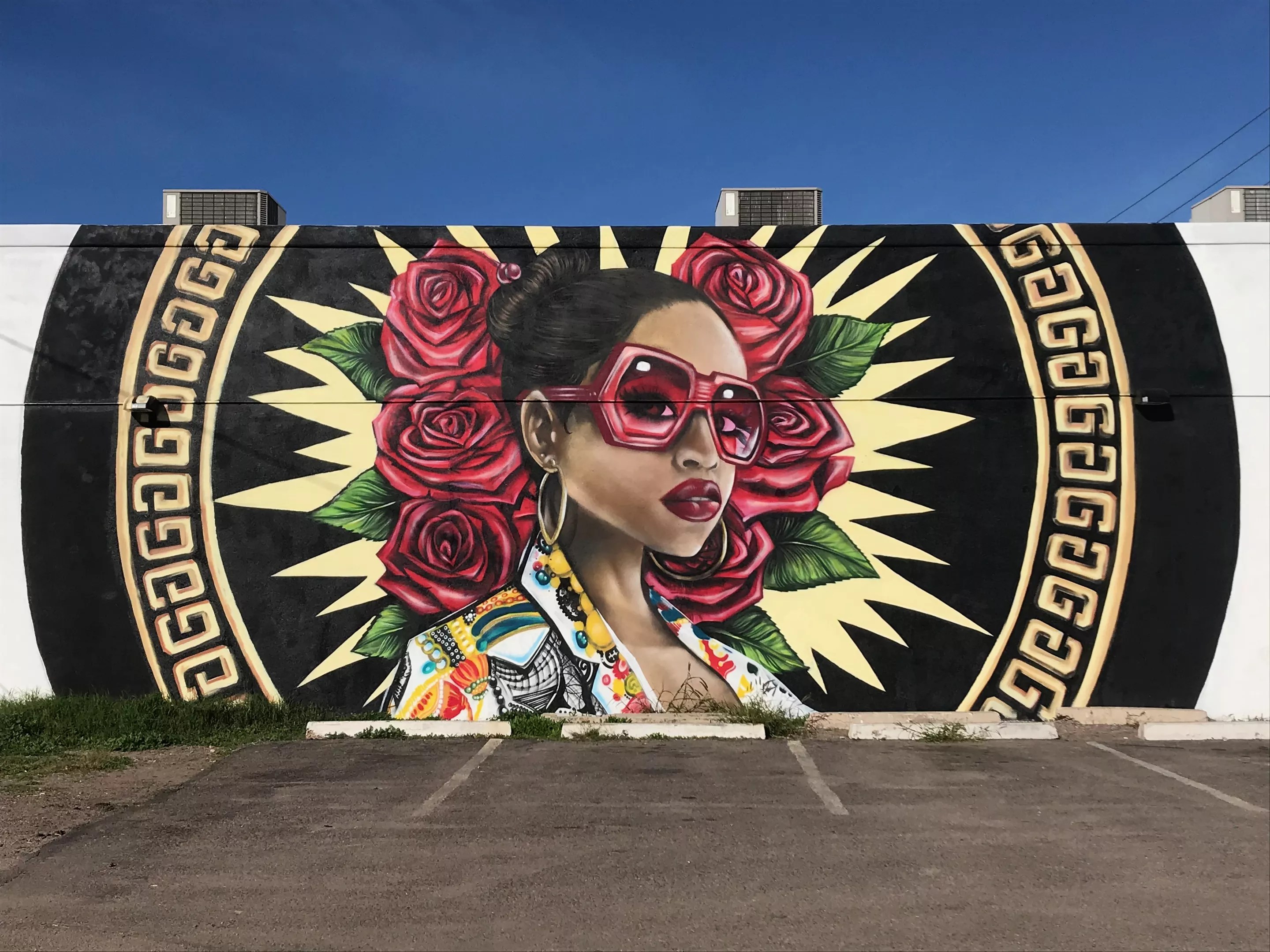 Several artists who work together under the name Graffaholeks Crew painted a giant portrait of a woman wearing rose-colored sunglasses, flanked by bold designs. It’s located on the south side of the Mia’s Flowers building at 1612 North 16th Street, which sits at the intersection with McDowell Road.