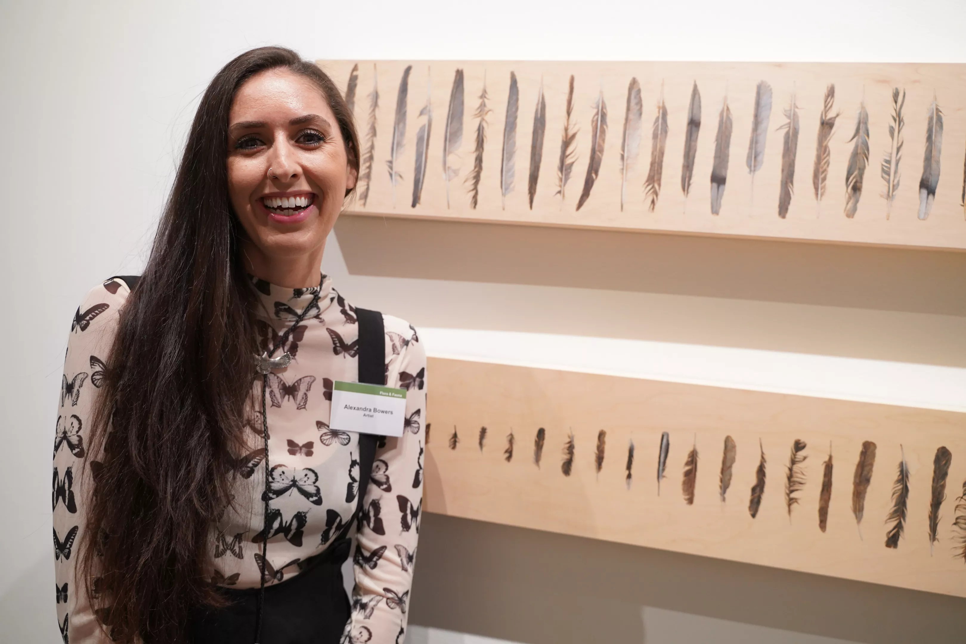 Alexandra Bowers with artworks previously shown at Mesa Contemporary Arts Museum.