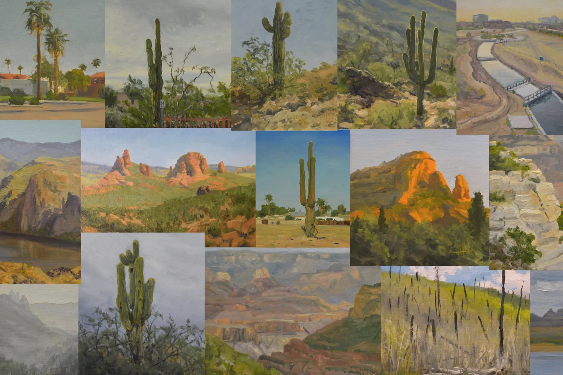 Hank explores “the encroachment of urban space into the desert ecosystem,” according to exhibition materials for “Landscape Interrupted,” an exhibition of the alter-ego’s oil paintings on view through Wednesday, February 28, at The Gallery at Appaloosa Library, 7377 East Silverstone Drive in Scottsdale.