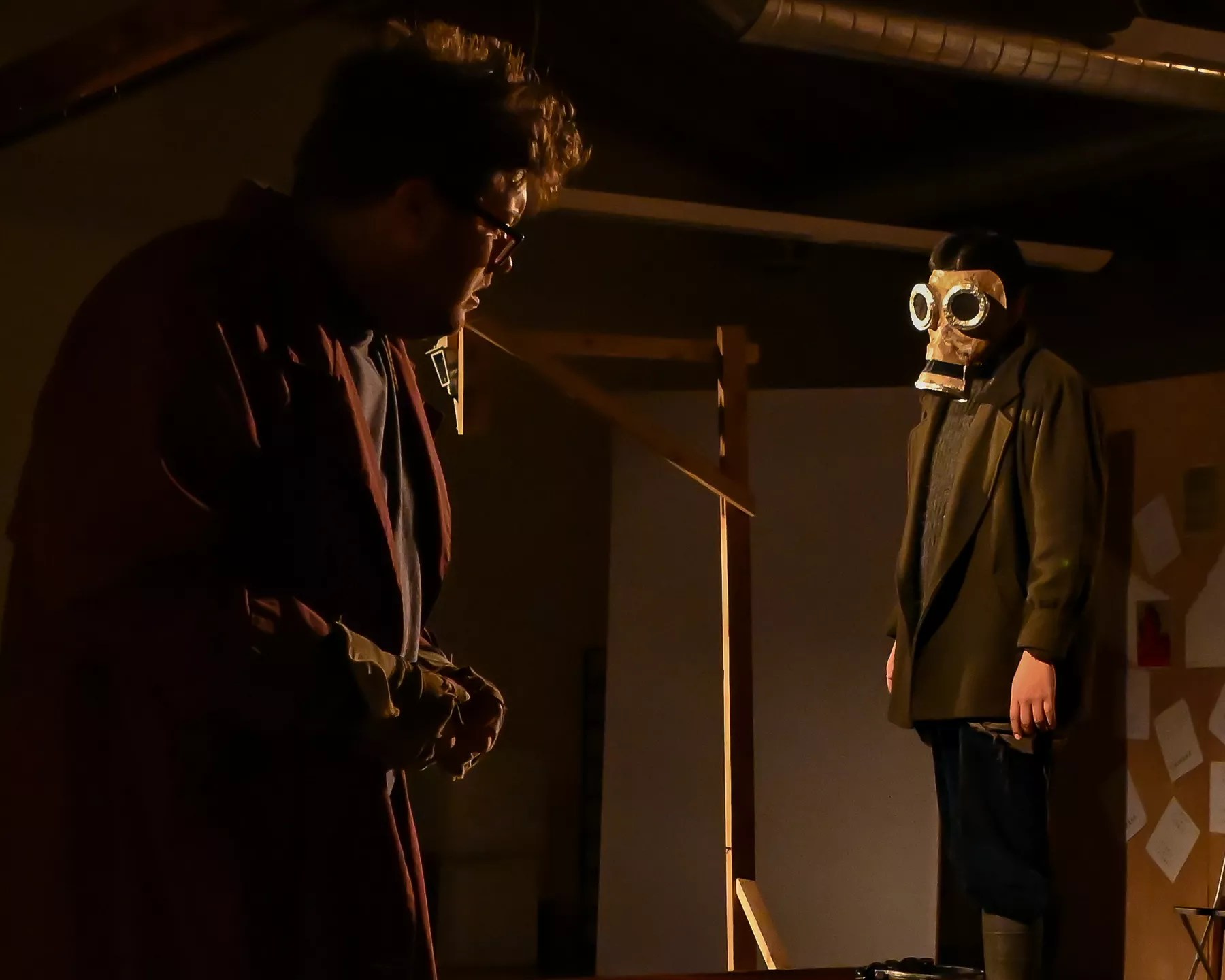 In its press release for Bryant Mason’s Empty Words (an adaptation of Dostoevsky’s Crime and Punishment), B3 Productions cited Terry Gilliam’s Brazil as an inspiration. Watching this haunting, ominous show , it struck me that Stanley Kubrick’s The Shining would be an even more apt comparison. Disheveled and seething with violent paranoia, Randy Rice’s ax-wielding Raskolnikov looks like he came to Aside Theatre straight from the Overlook Hotel. Just as Jack Nicholson’s character had ghosts prompting him to go on a rampage, Rice’s murderer has a spectral accomplice of his own: the eerie, slow-walking, gas mask-wearing Svidrigailov (played by Victor Arevalo). Randy Rice and Victor Arevalo in B3’s Empty Words. Laura Durant