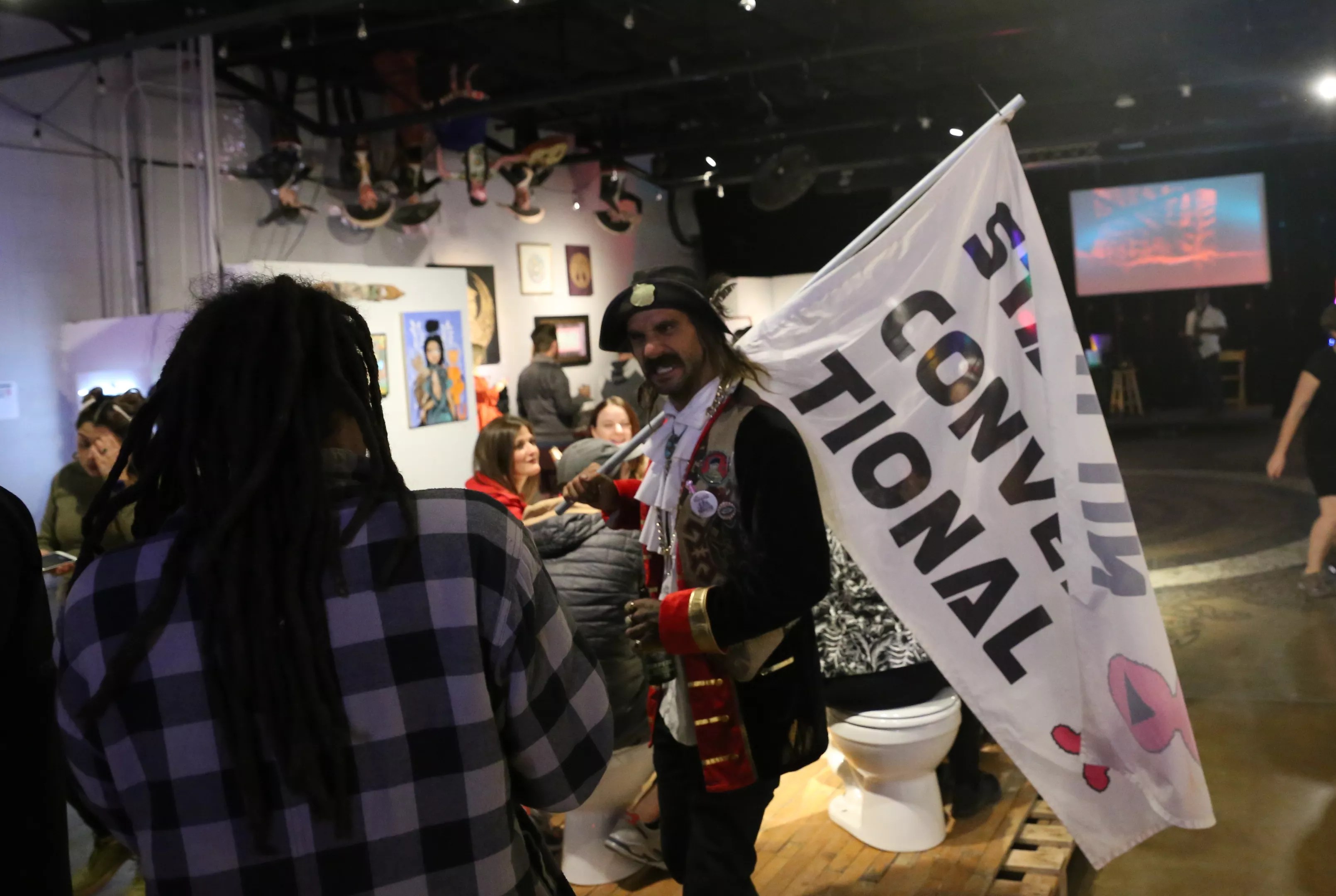 Mike Butzine, dressed in a bold pirate costume that belies his gentle nature, proudly waved the flag bearing Snood City’s motto, “Stay Unconventional.” He and his partner Michelle Meyer took over Unexpected Gallery on Grand Avenue for a show with the humble goal of “representing a bunch of the homies that have helped contribute to Snood Men and Snood City.”