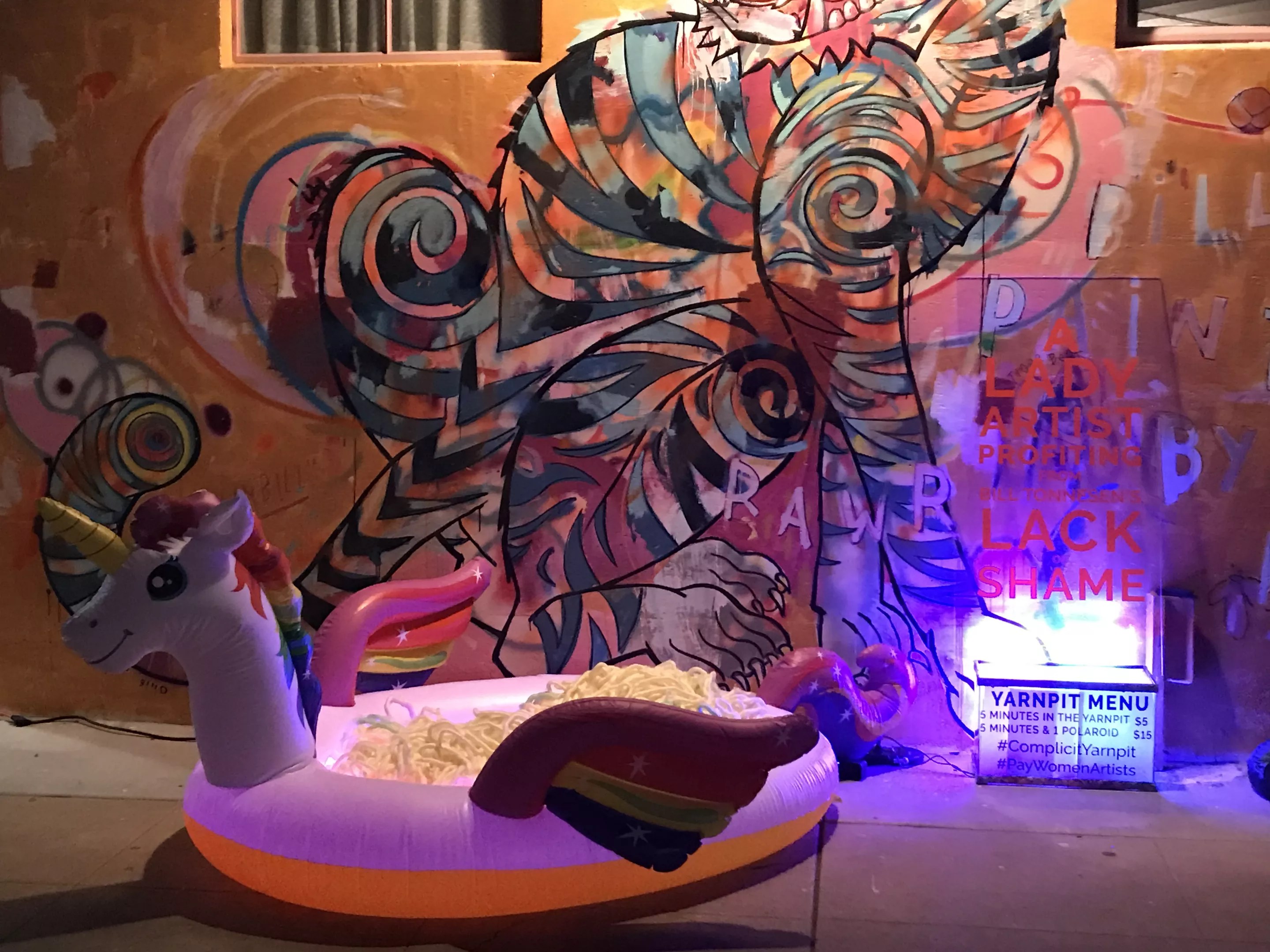 Artwork spilled out of Cobra Flute Projects onto the street as Bill Dambrova paid homage to 13 artists he credits with inspiring him to “loosen up, lighten up, and let go” of self-imposed restrictions or limits. Outside the studio, a work Malena Barnhart created with James Bewley, set against a new mural by Dambrova and Gino Belassen, referenced recent #MeToo revelations on the local arts scene. Inside, artists showed works reflecting myriad objects, including Ring Pop candies, wishbones, and pacifiers. Turner G. Davis showed 12 pieces comprising complex visual stories, inspired by sources such as the 1954 film Creature from the Black Lagoon, 19th-century French painter Henri Rousseau, and Facebook. Checking out a new mural and work referencing #MeToo revelations on the local arts scene. Lynn Trimble