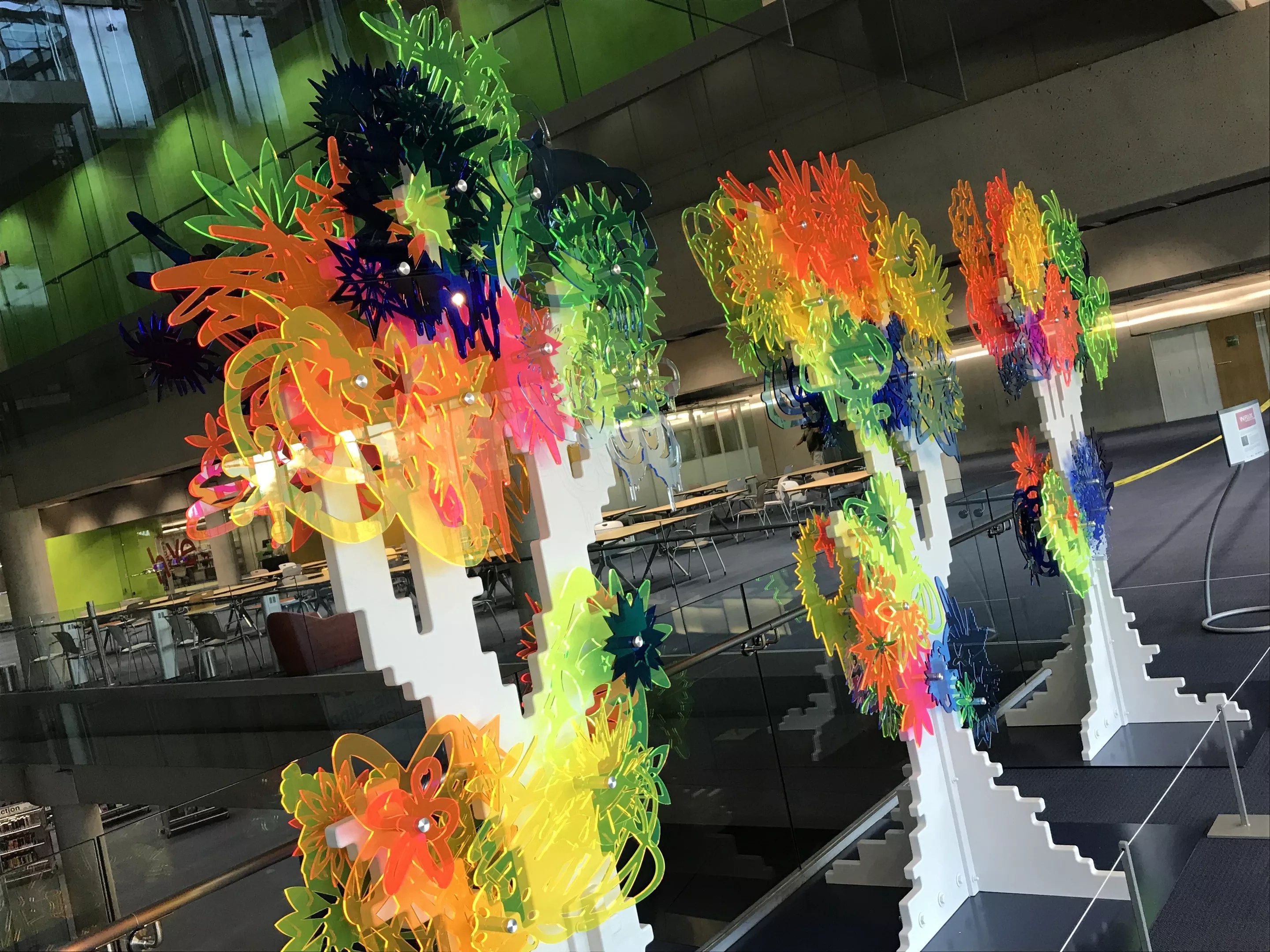 Giant beaded animals and a trio of fluorescent trees took root at Burton Barr Central Library in April, as part of cycle 8 for a multi-community public art project called IN FLUX. Christy Puetz created Curious Creatures, a group of whimsical white beings installed near the entrance to the first-floor children’s area. Daniel Funkhouser created Radiant Grove, a set of three large trees made with multicolor laser-cut acrylic. They’re installed on the second floor of the library, where the light streams through the windows to make them especially vibrant and engaging. Together, these offbeat sculptures deliver a sense of discovery and joy.