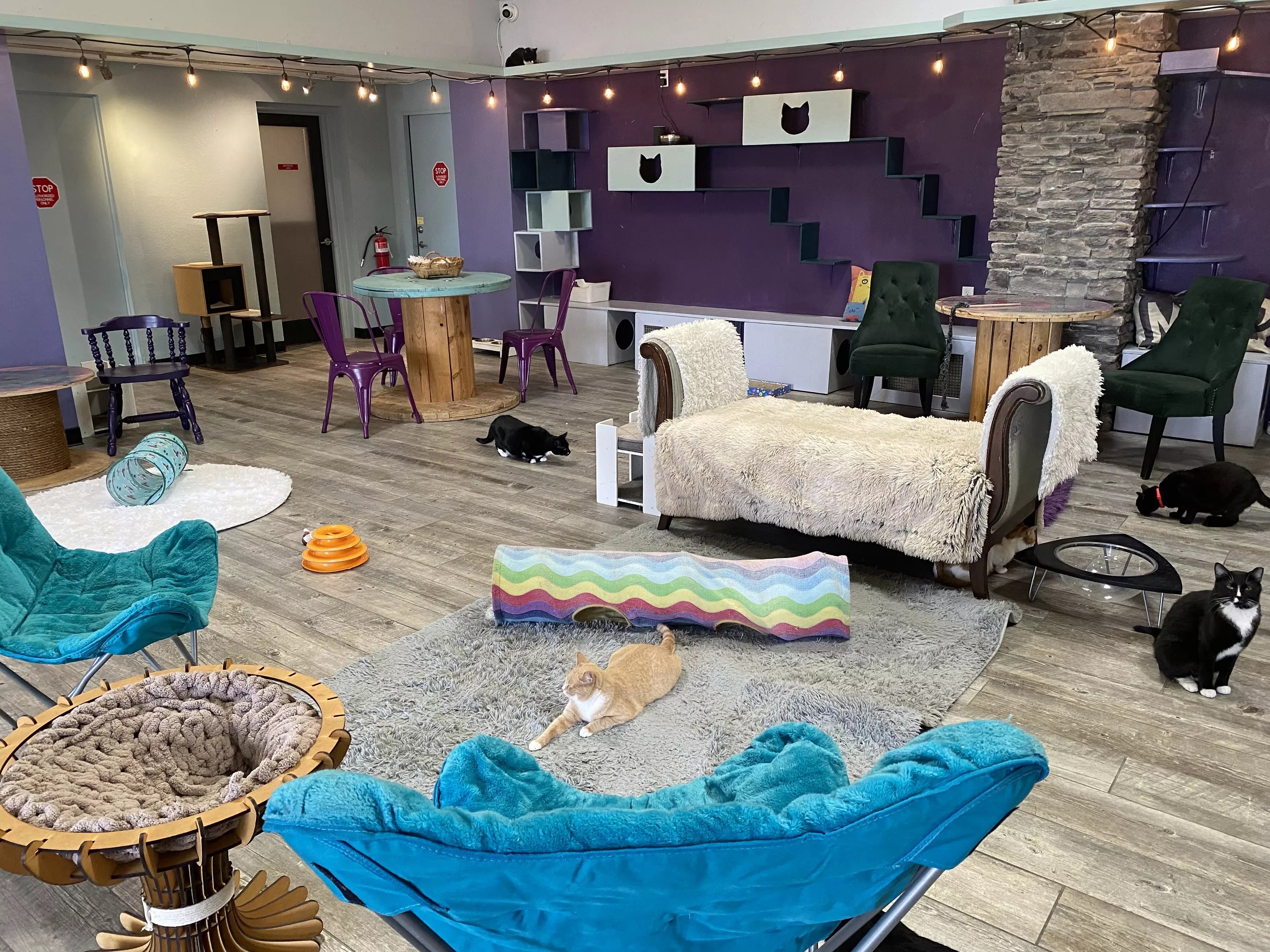 The cafe also sells daily, monthly, and yearly passes and hosts special events like paint night, drag bingo, and yoga with cats, which can be booked online. Regular lounge hours are 10 a.m. to 6 p.m. Thursday and Sunday and 10 a.m. to 8 p.m. Friday and Saturday.