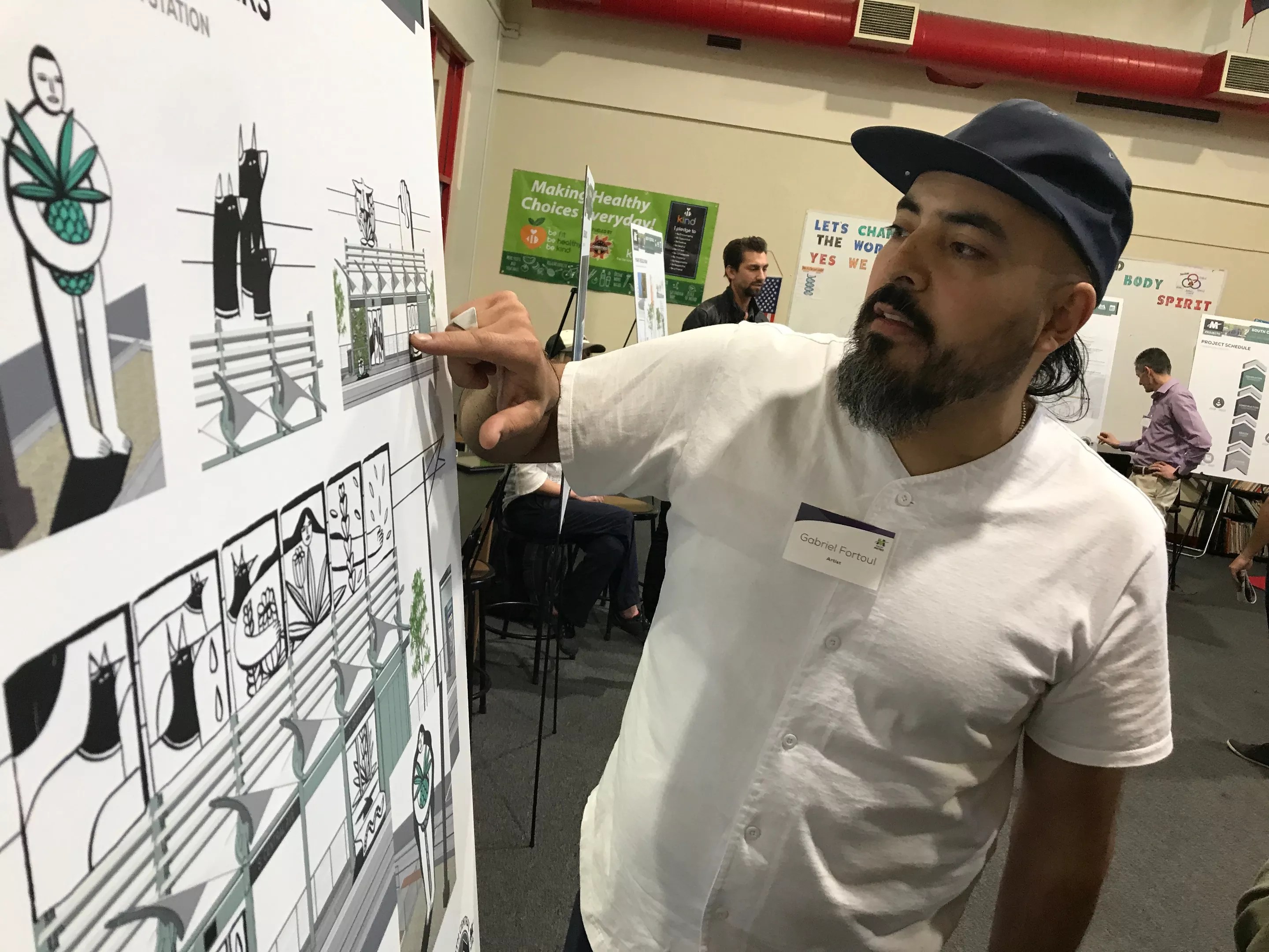 Martin Moreno talks with community members about a light-rail design created with Emily Costello.