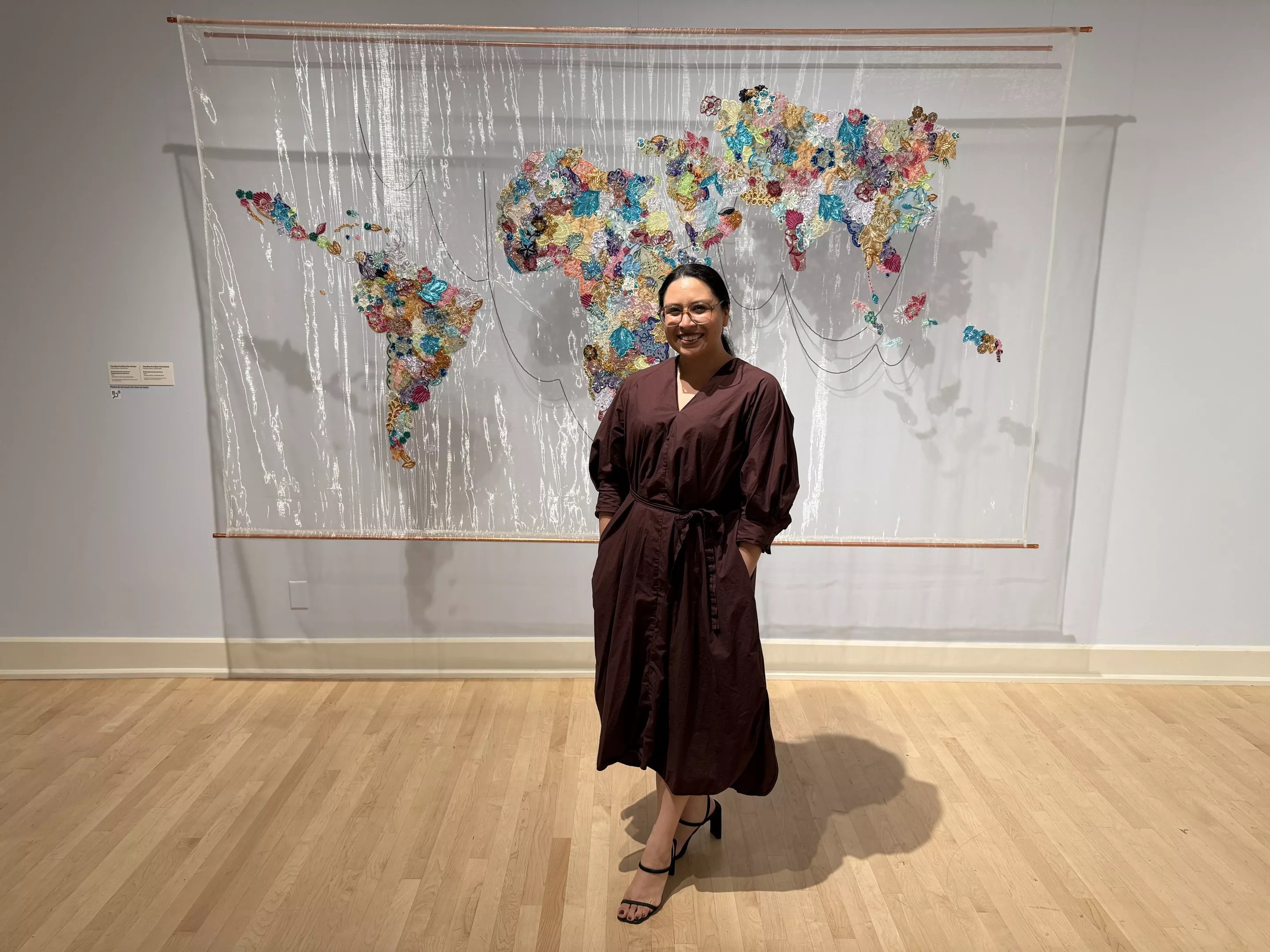 Senior curator Alana Hernandez in front of “El desplazamiento y las flores” (2021) by Carolina Aranibar-Fernández.