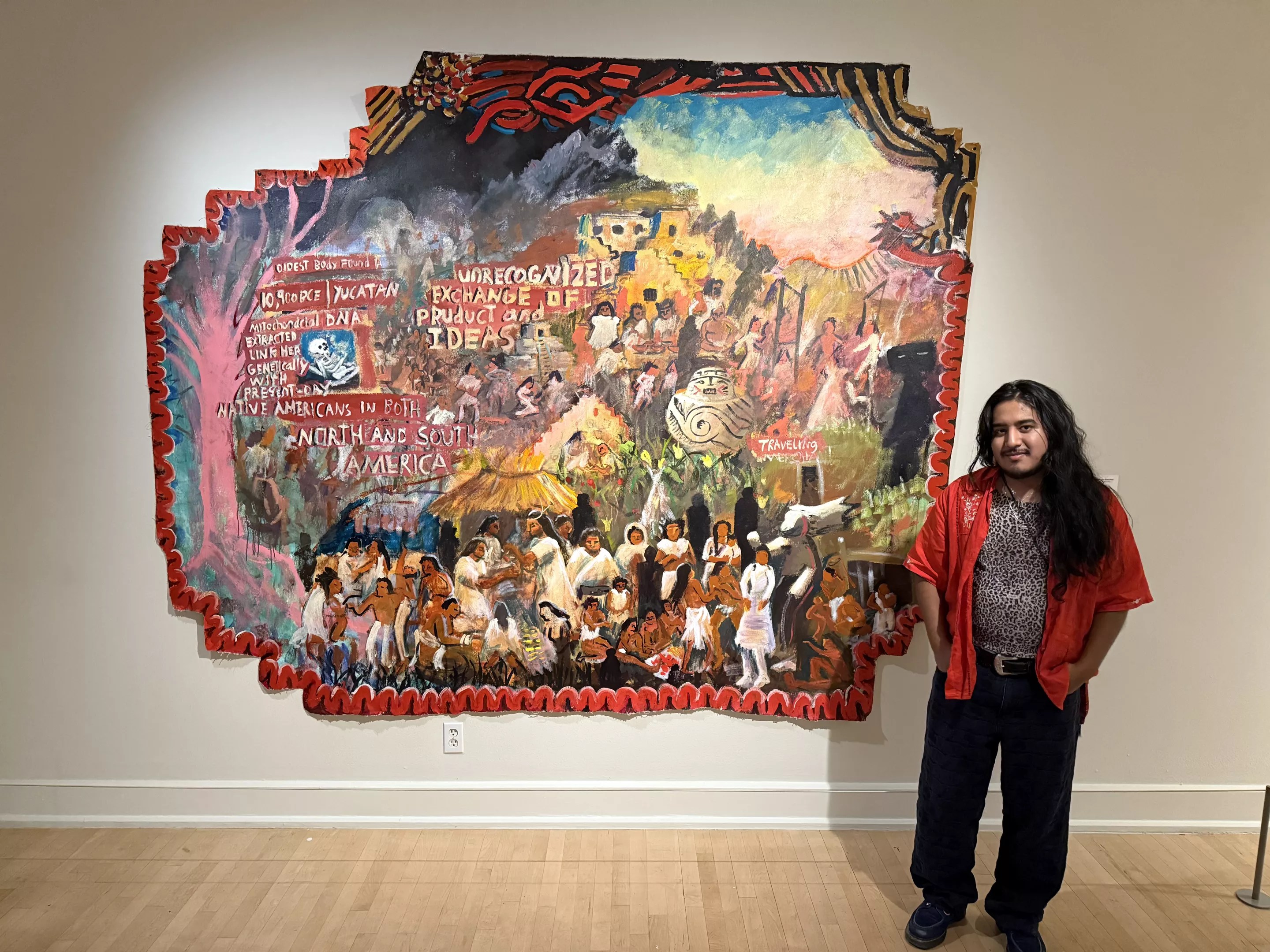 Manuel Hernandez Sanchez in front of his artwork “Unrecognized Exchange” (2023). From the Gochman Family Collection.