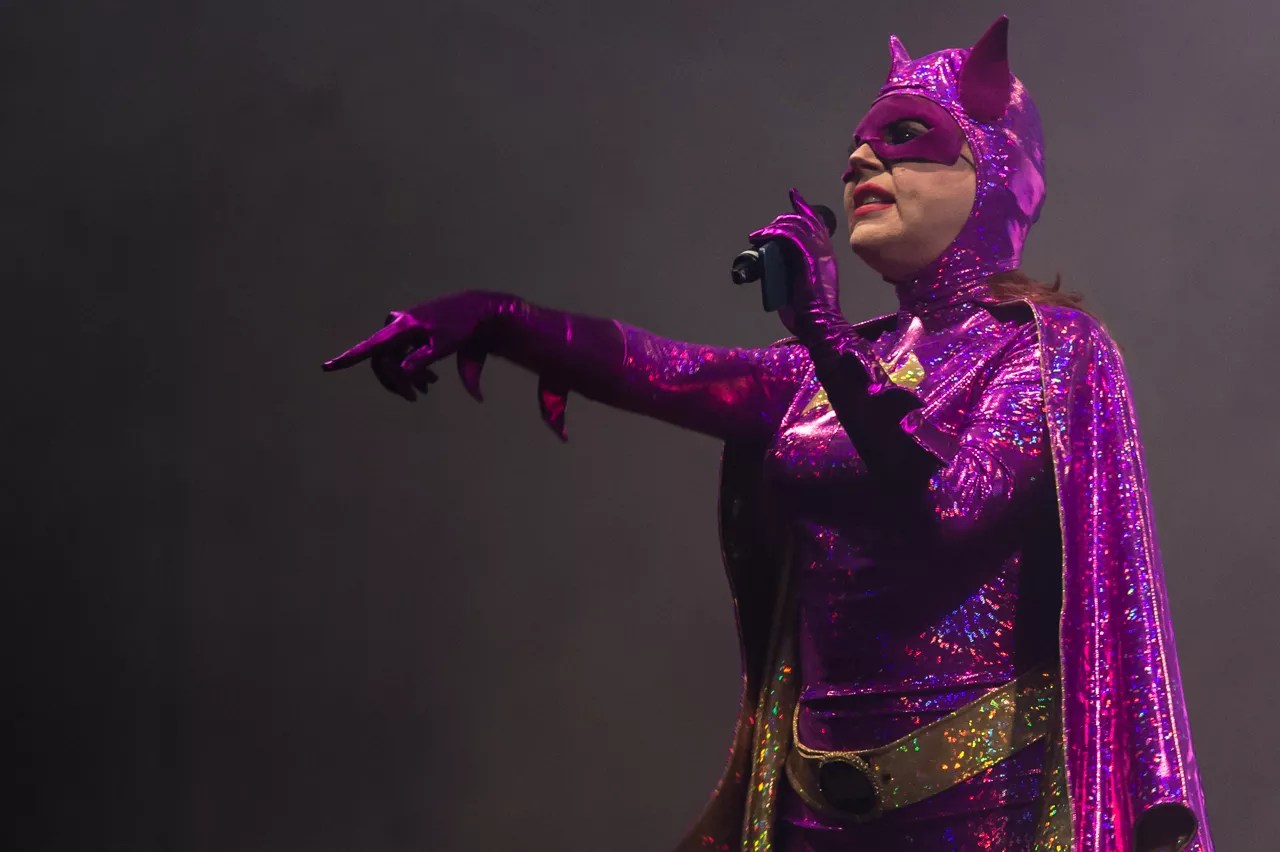 Phoenix drag queen royalty Barbara Seville emceed Dragstravaganza at Phoenix Fan Fusion 2023 while wearing a shiny, purple Batman costume.