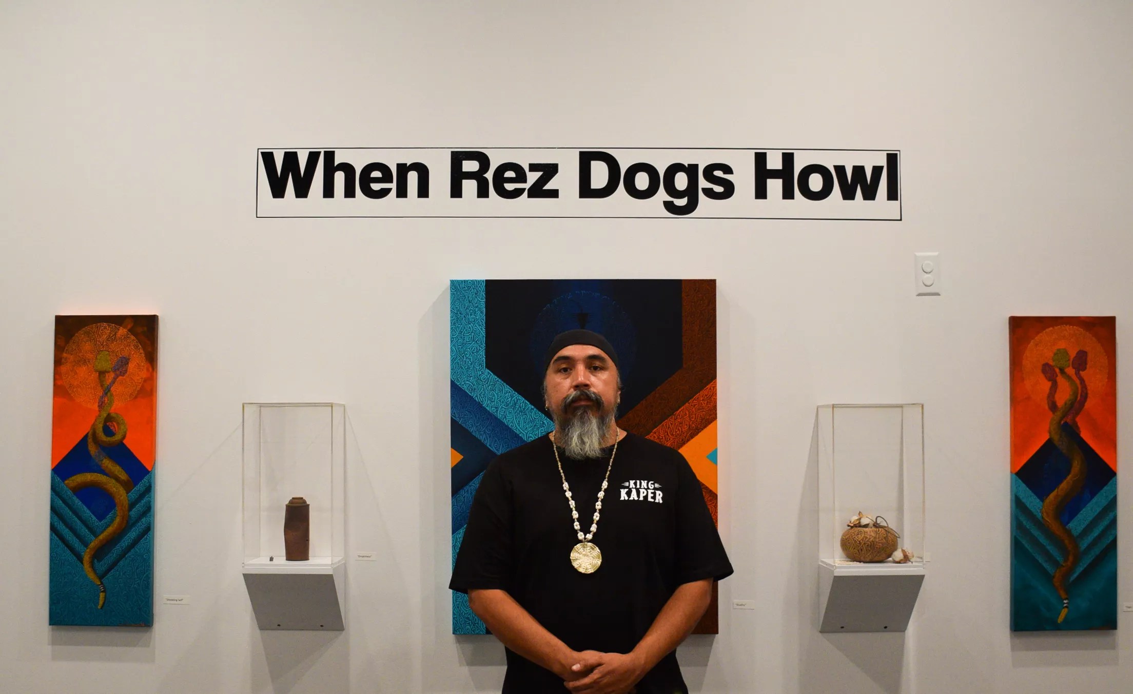 Thomas “Breeze” Marcus poses with his exhibit, “When Rez Dogs Howl,” on display through May 14 at S’edav Va’aki Museum.
