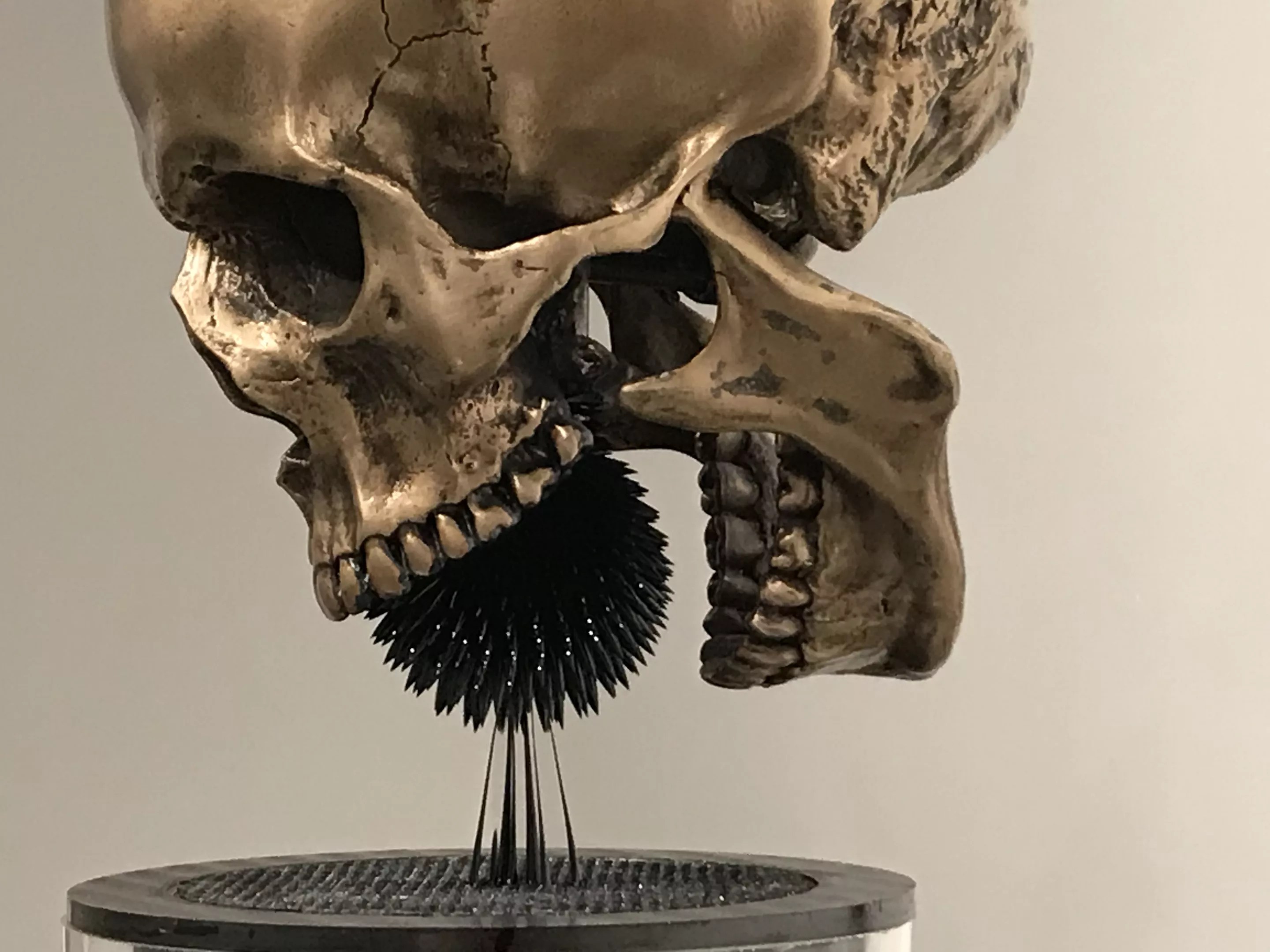 Devoid of context, some people might delight in seeing Mesplé’s Killing Time. It’s a kinetic hourglass triggered by movement, which has a black liquid oozing from the open mouth of a golden skull. But others will be disappointed because it pales in comparison to the rich tradition of “vanitas” artworks that explores issues of love and death with still-life paintings that often incorporate the human skull.