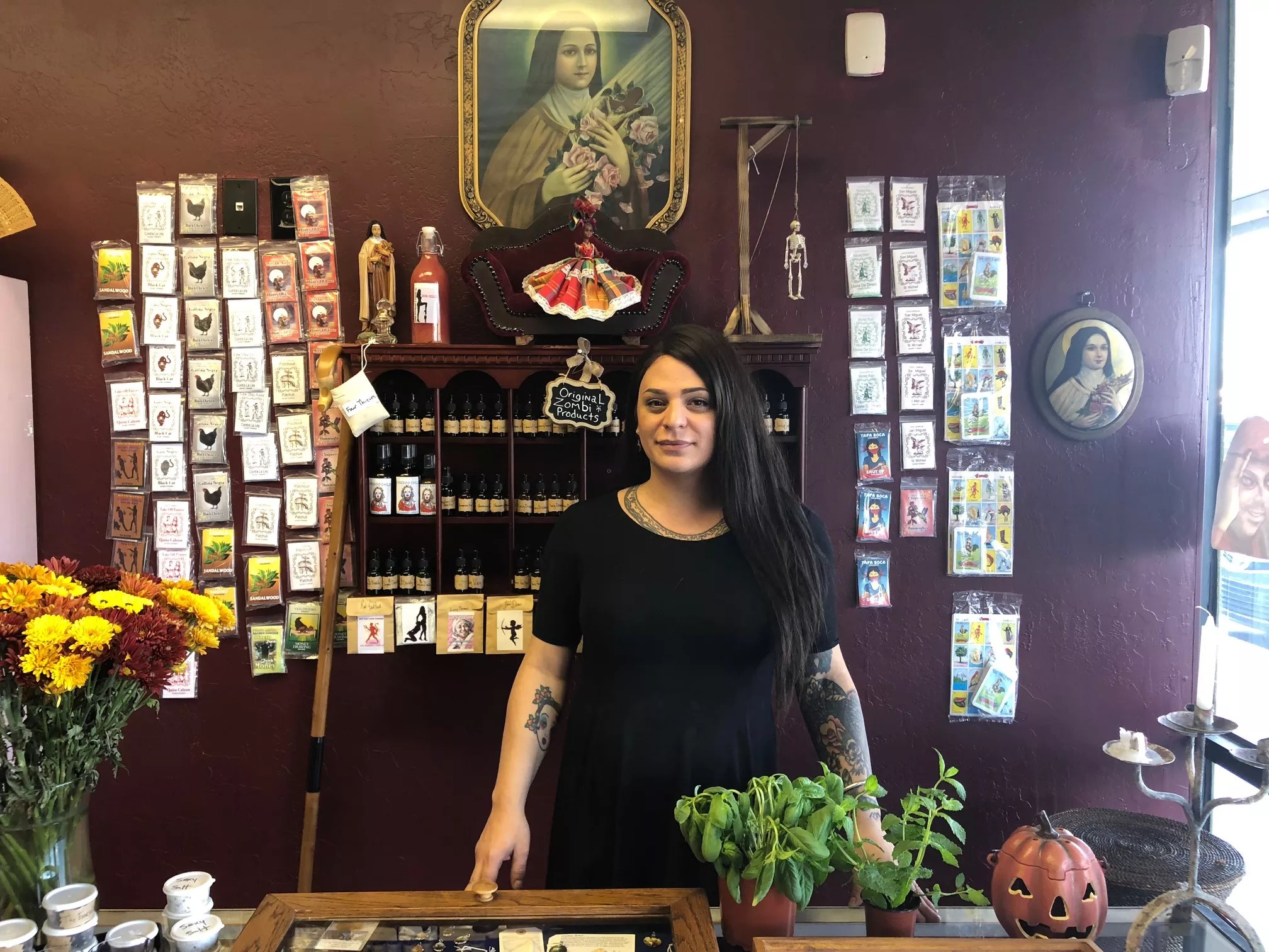 Instead of an angelic white paint job, the interiors of Zombi have a rich burgundy hue. Fragrant, label-less candles greet you when you walk in: rows and rows of bright yellow and orange wax. The walls are decorated with a myriad of unusual objects – shell necklaces, old dolls, goat statues, framed butterflies, even a Betty Crocker cookbook with a pentagram on the cover. Offering a tour of her shop, El-Masri points at a handful of crucifixes lining one corner of the shop.