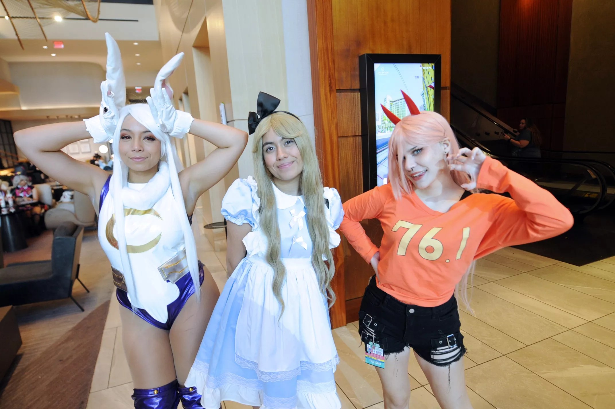 These friends are cosplaying Mirko from “My Hero Academia,” left, Alice from “Alice in Wonderland, center, and Power from “Chainsaw Man.”