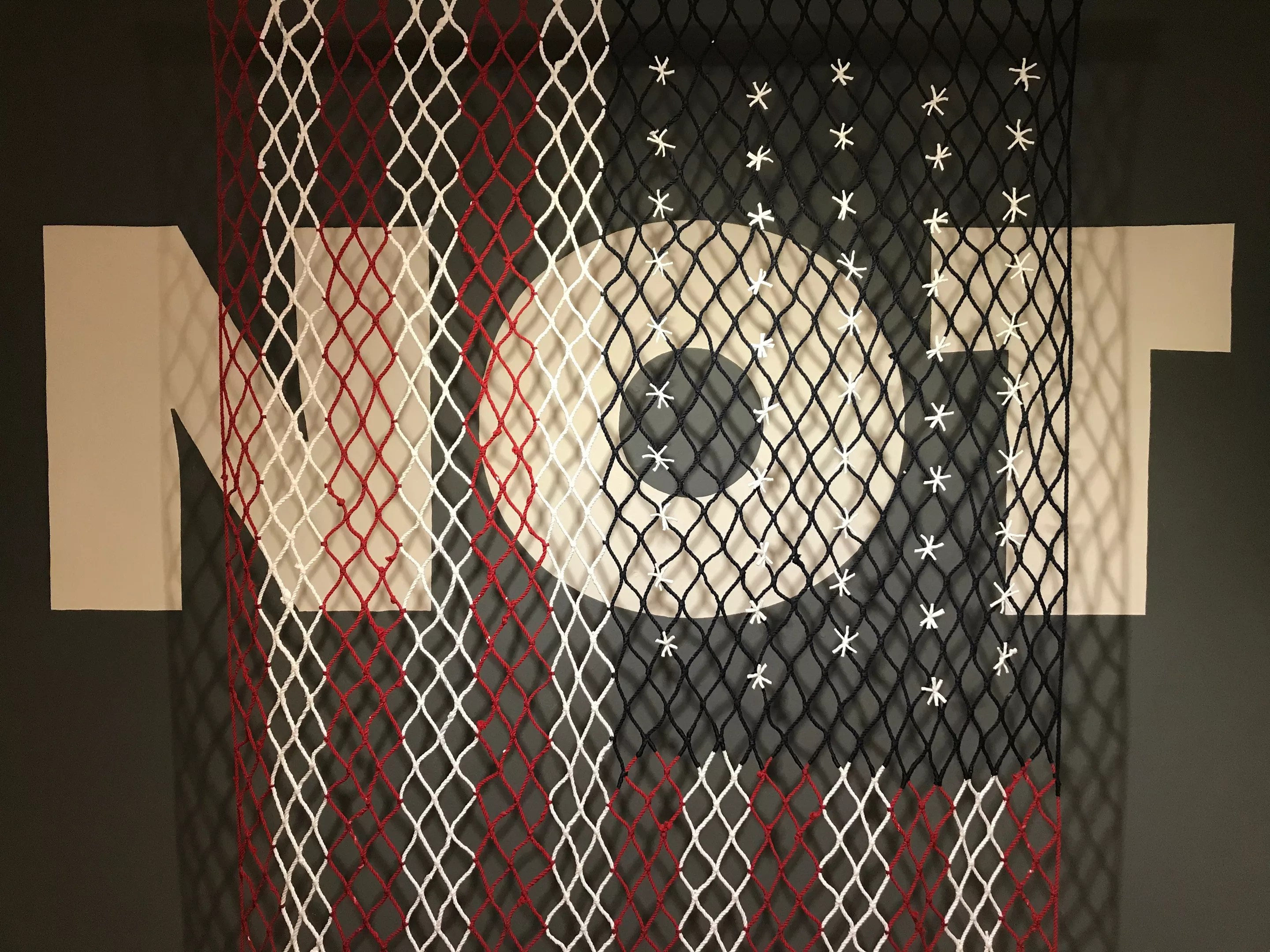 More recently, she’s created works that reference President Donald Trump. For a group show held after his election, she created a simple white handkerchief embroidered with red and blue thread, altered with editing marks to read “We are fucked.”