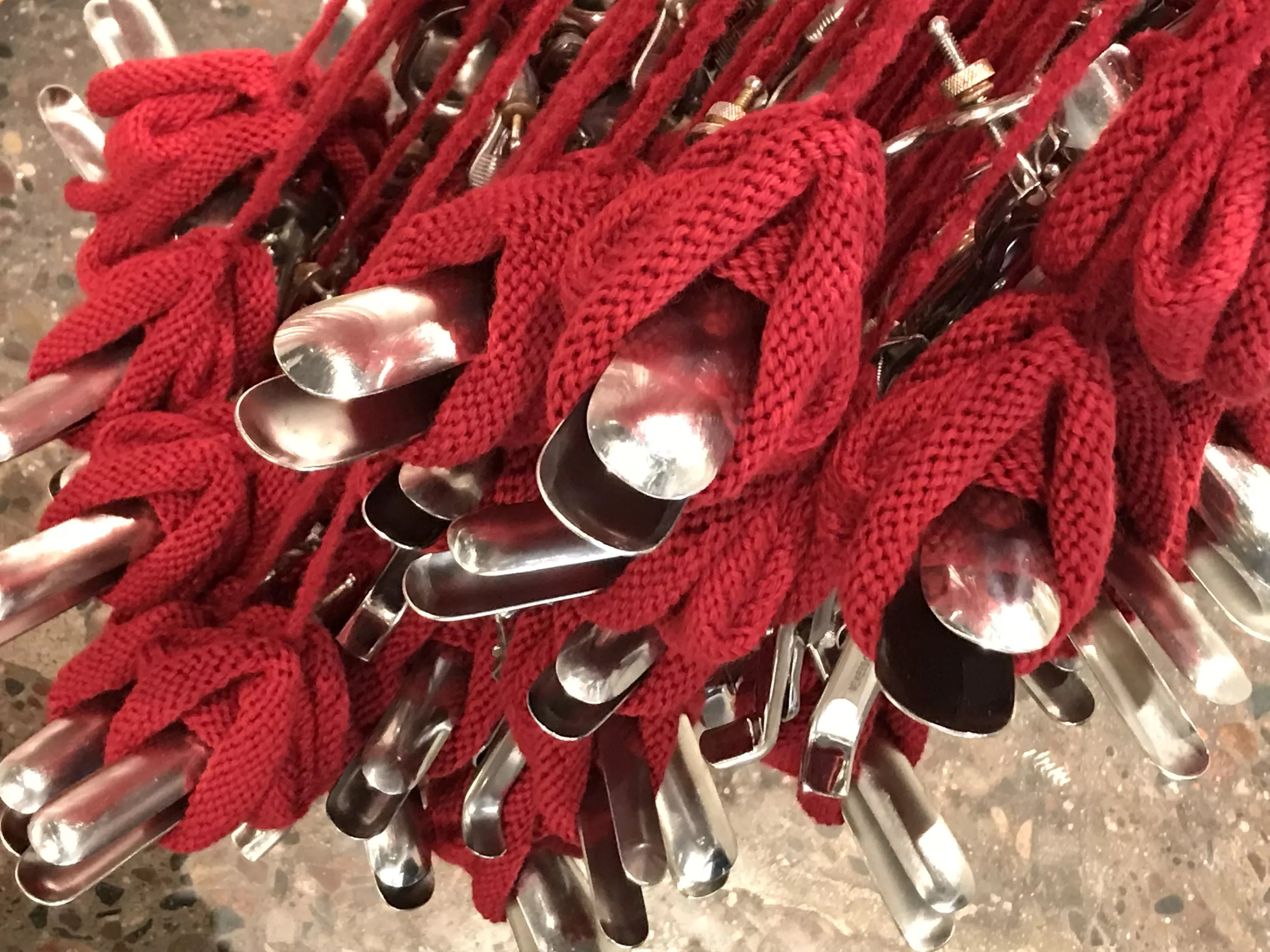Ann Morton’s When I’m 64 includes metal speculums set inside red V-scrunchies.