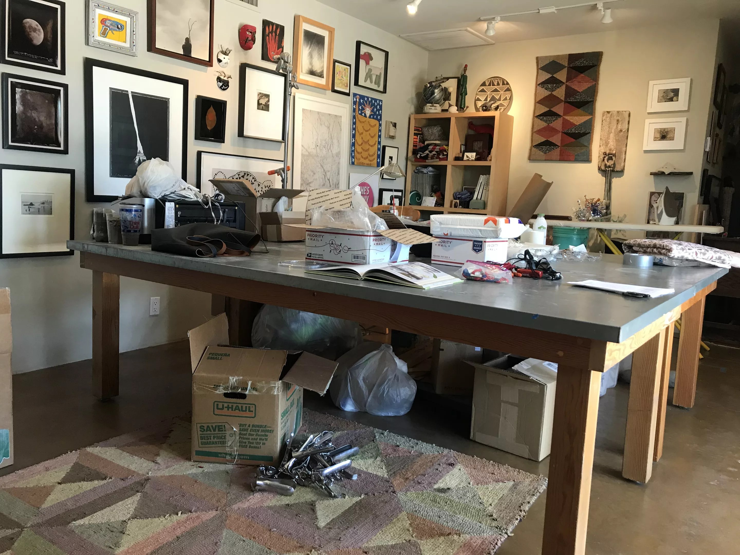 Here’s the massive work table where Ann Morton built her Re-Thanks installation.