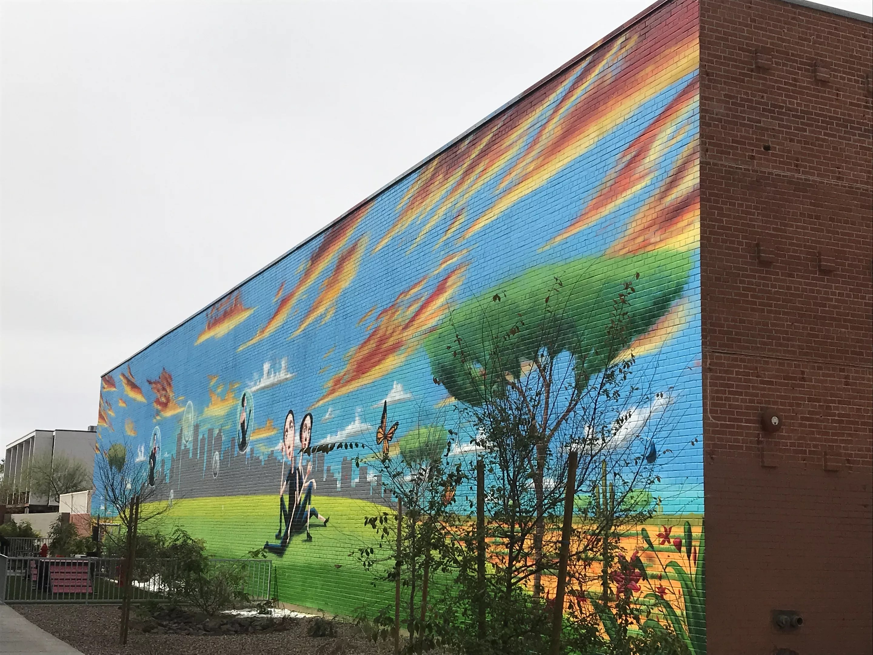 Phoenix artist Tato Caraveo recently painted a new mural on the south-facing wall of Arizona Opera. It depicts a couple sitting on a grassy knoll, holding bubble wands. They’re part of a landscape that includes desert plants and flowers, and a sunset sky.