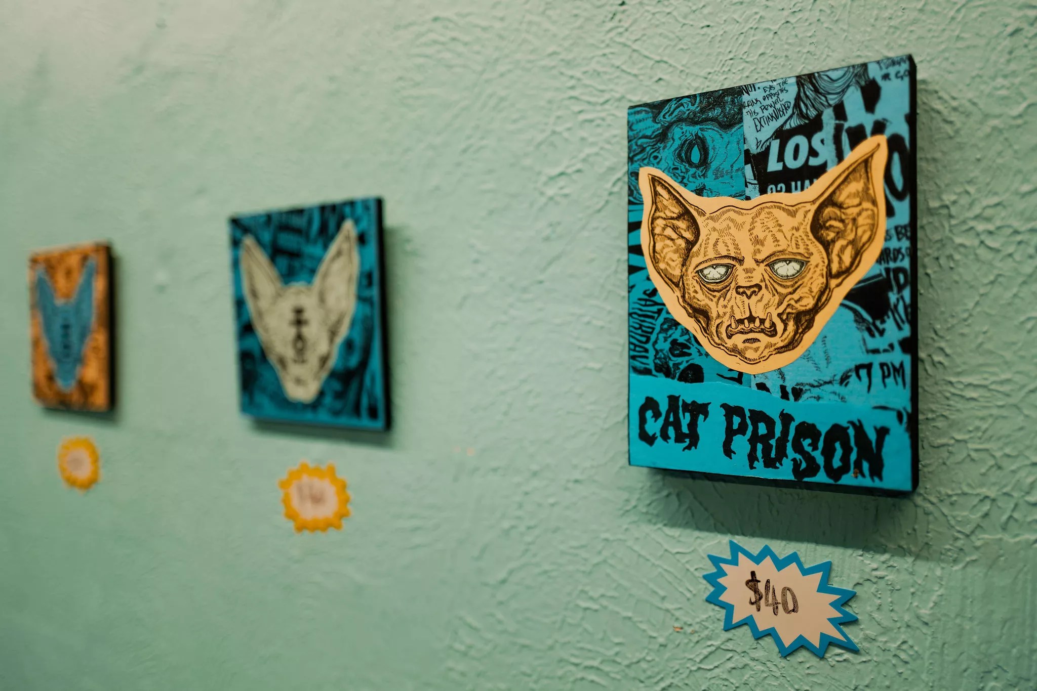That essence was on full display April 25 at the Danelle Project’s final two shows – a “Cat Prison” exhibition of 75 cat portraits created by, and a “Black and Red” show featuring the work of about 80 artists, curated by artists Matt Dickson, Luster Kaboom and Seth Manic Tongue.