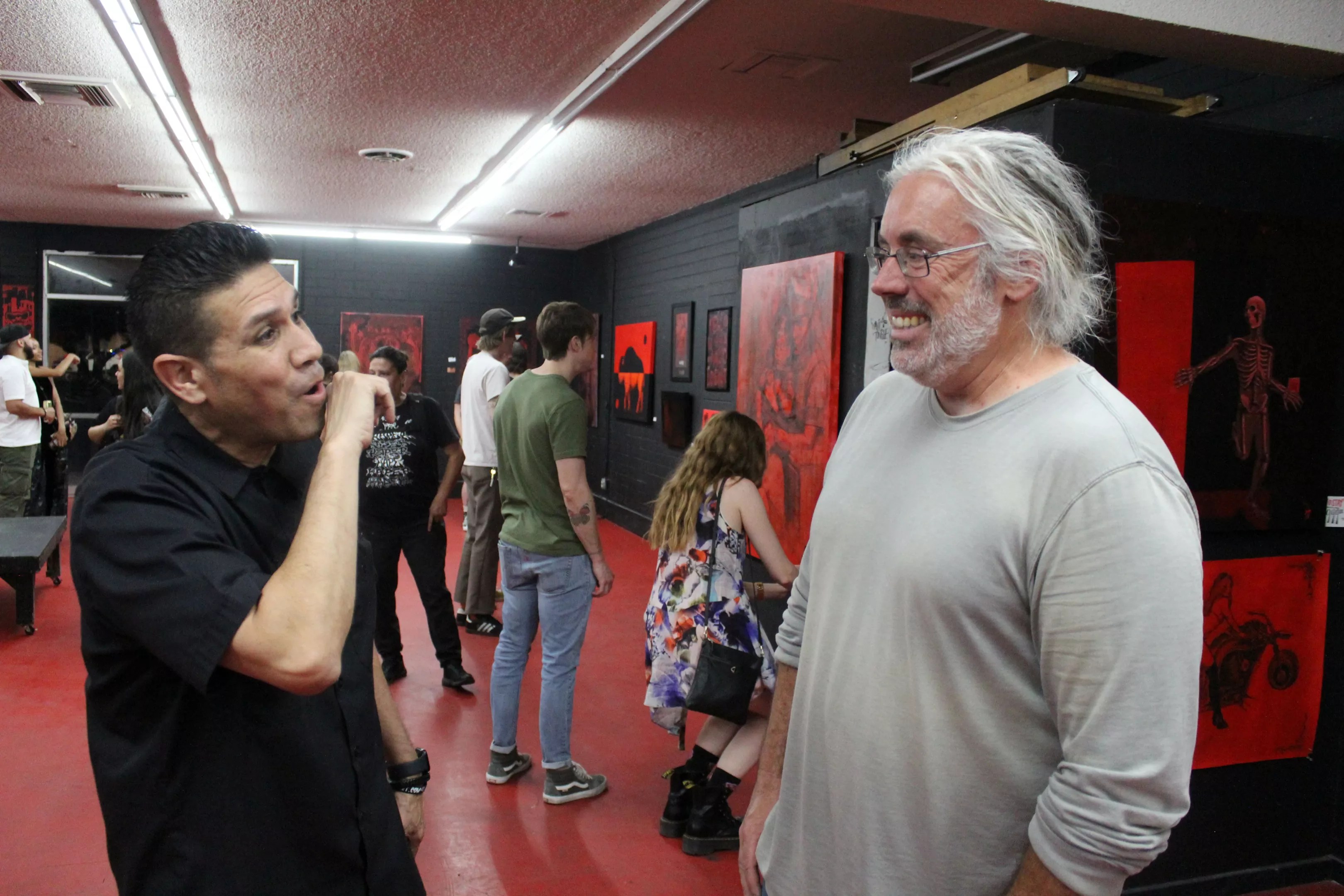 Such Styles, left, and Rob Moore chat during the “Black and Red” exhibition on April 25.