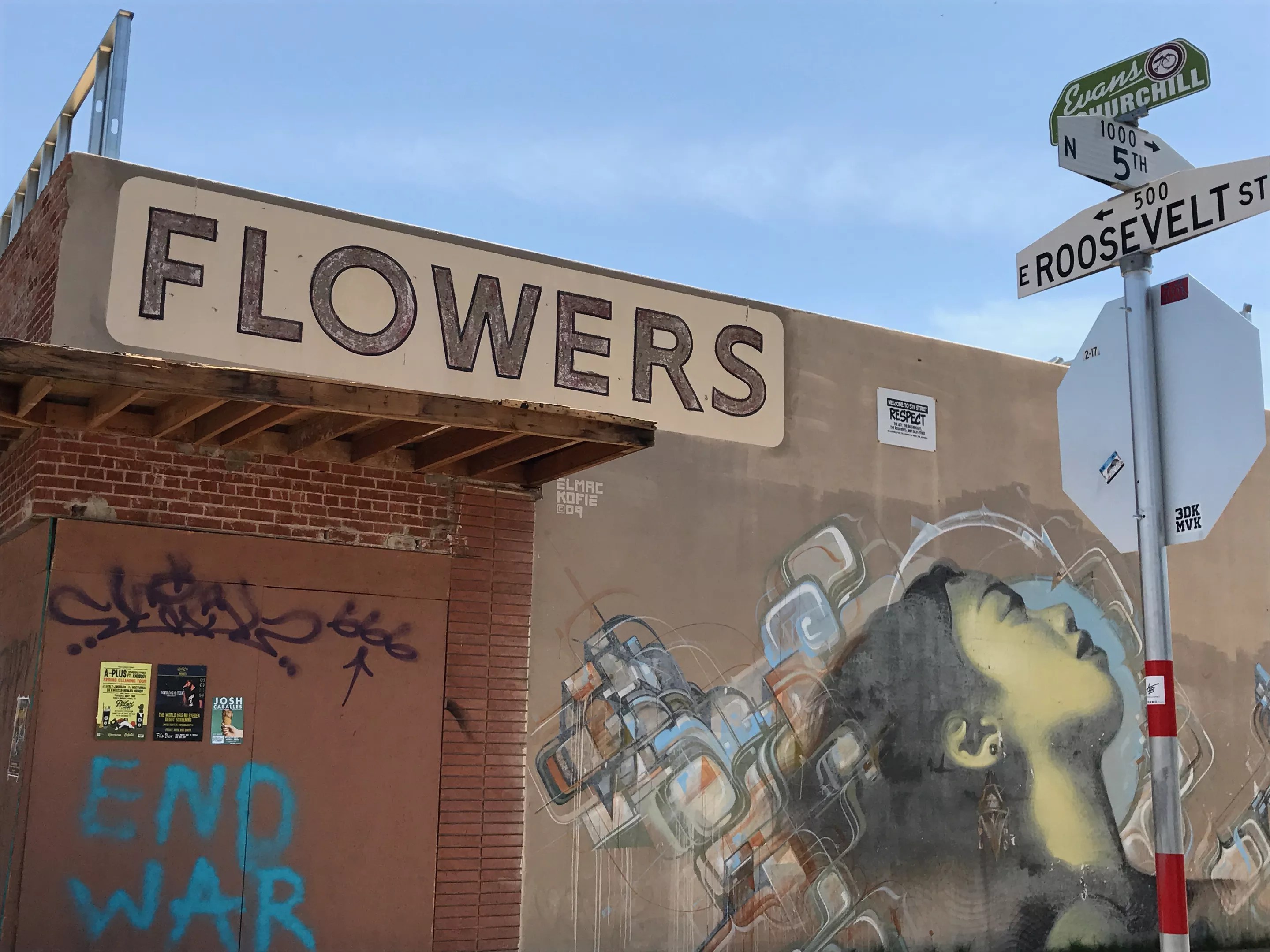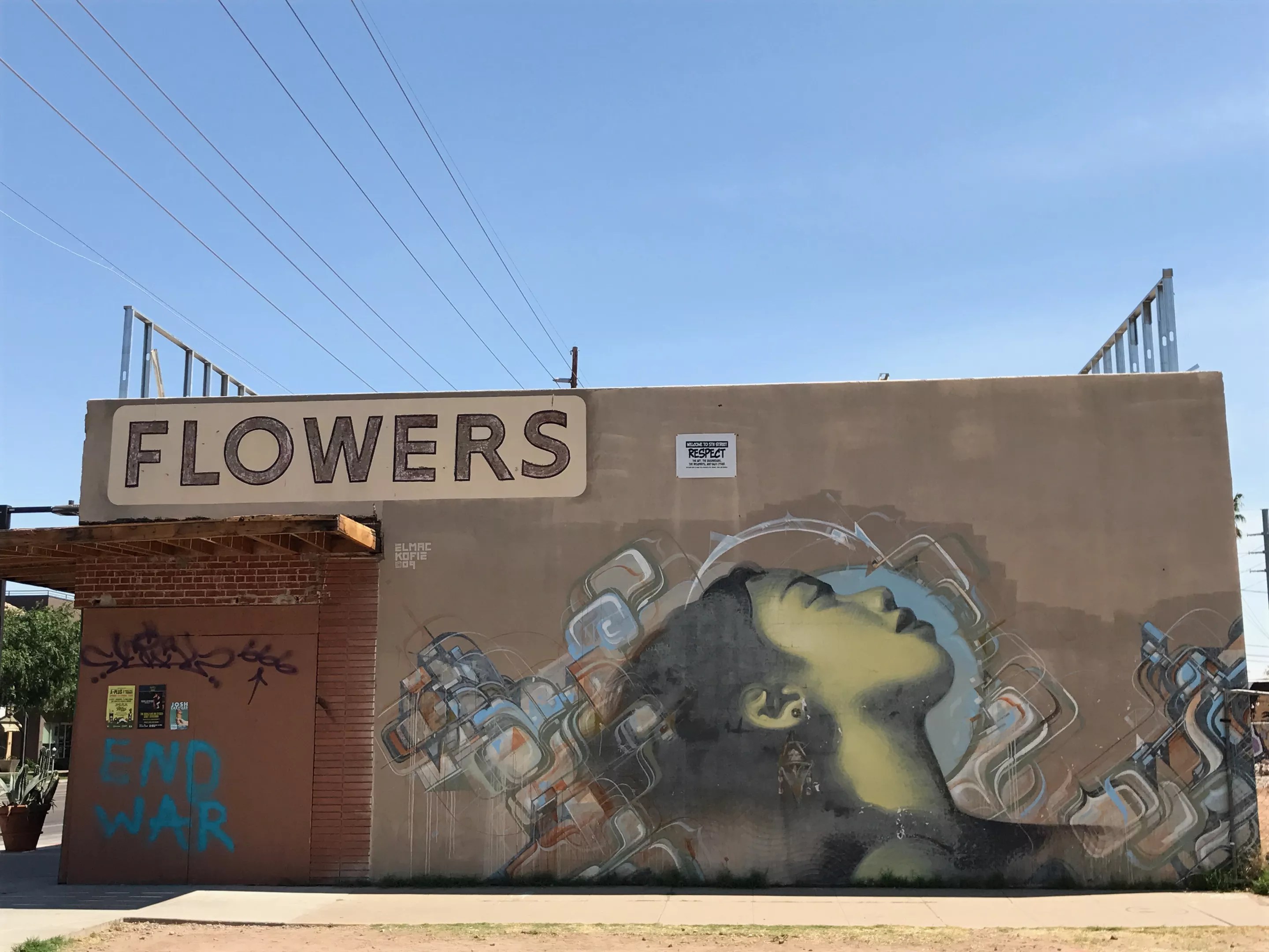 El Mac, an internationally renowned artist who grew up in Phoenix, painted the mural on a west-facing wall of the Flowers building at Roosevelt and Fifth streets back in 2009 with Augustine Kofie. It features the profile of a woman’s face, surrounded by geometric shapes.