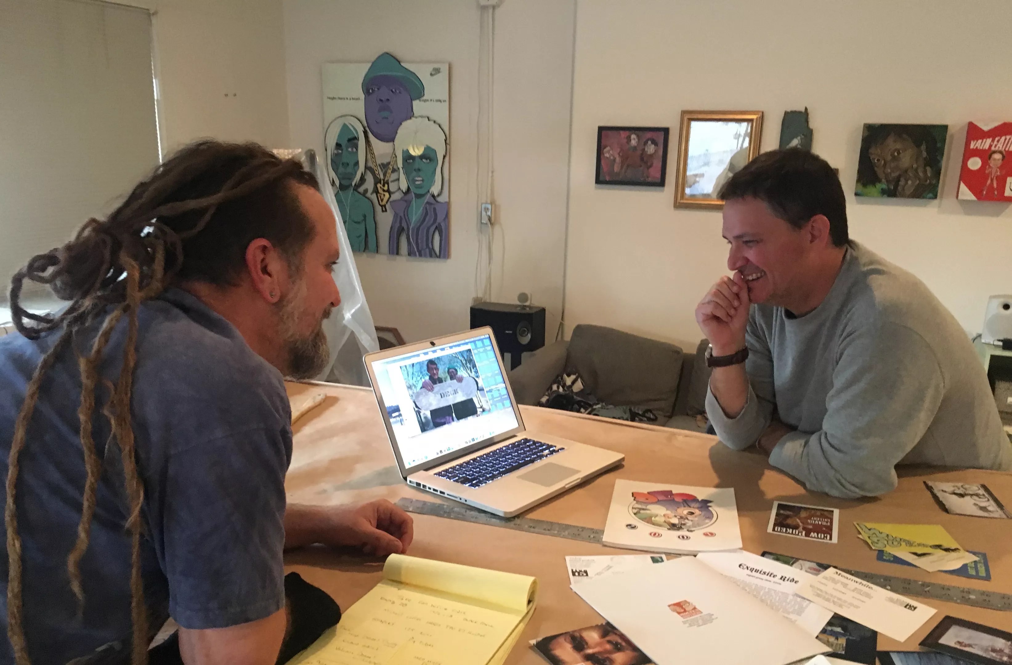 Mike Goodwin and Ken Richardson looking over old Five15 Arts materials.