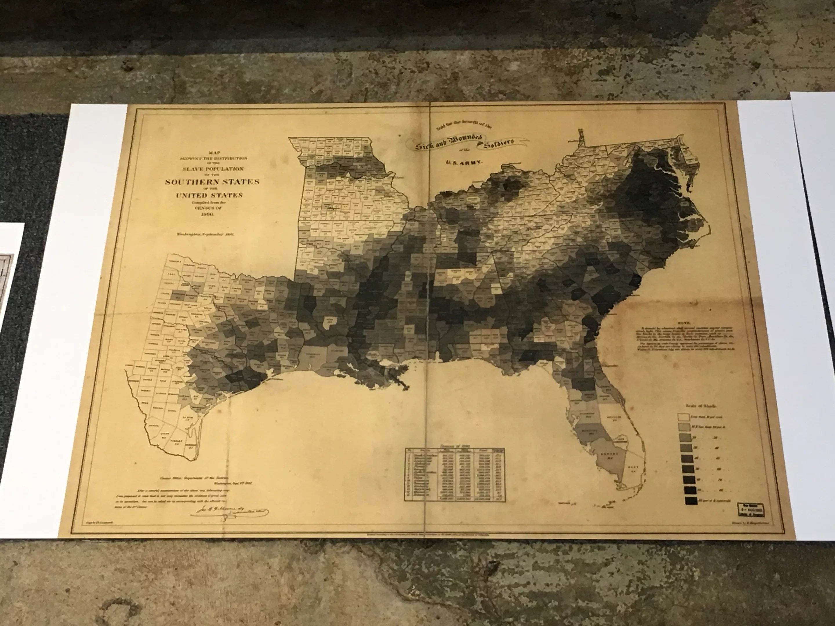 She’s showing a series of maps that reveal the geographies of slave ownership and Native relocation by the federal government, as well as currency with images that capture prevailing views of women, slaves, and Native people. But gallery-goers will also see works by two local artists – ASU professor Stephen Marc and Diné artist Averian Chee.