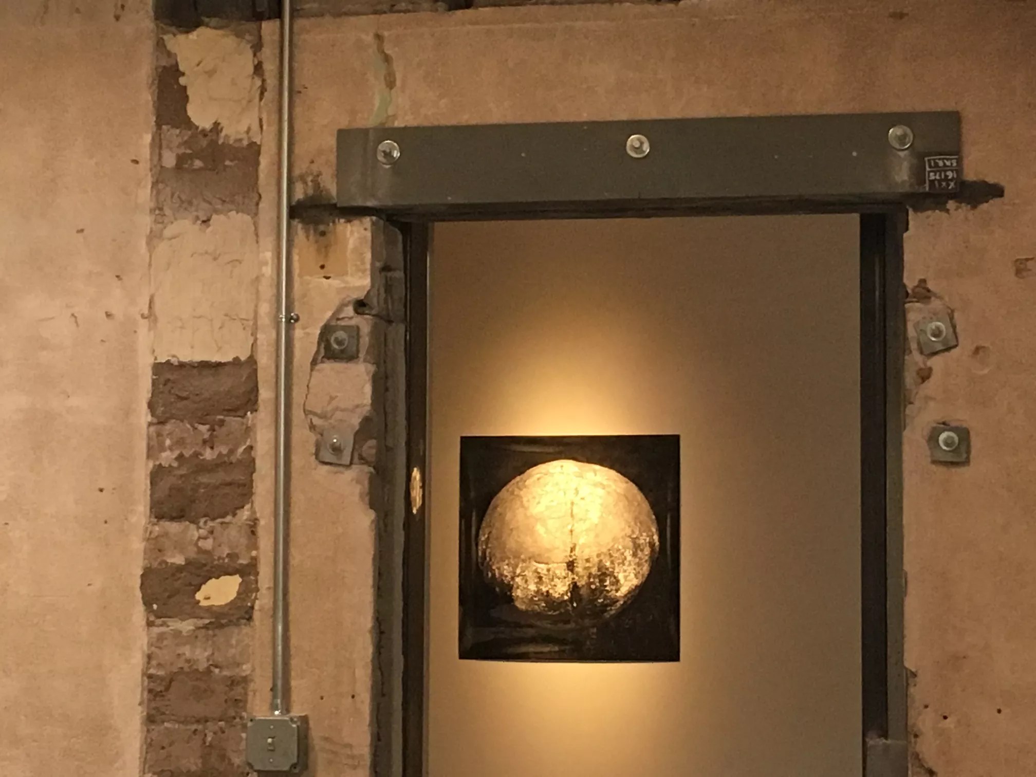 Cannonball Concretion Study (B15) by Krista Elrick, viewed from a preparation space inside Northlight Gallery.
