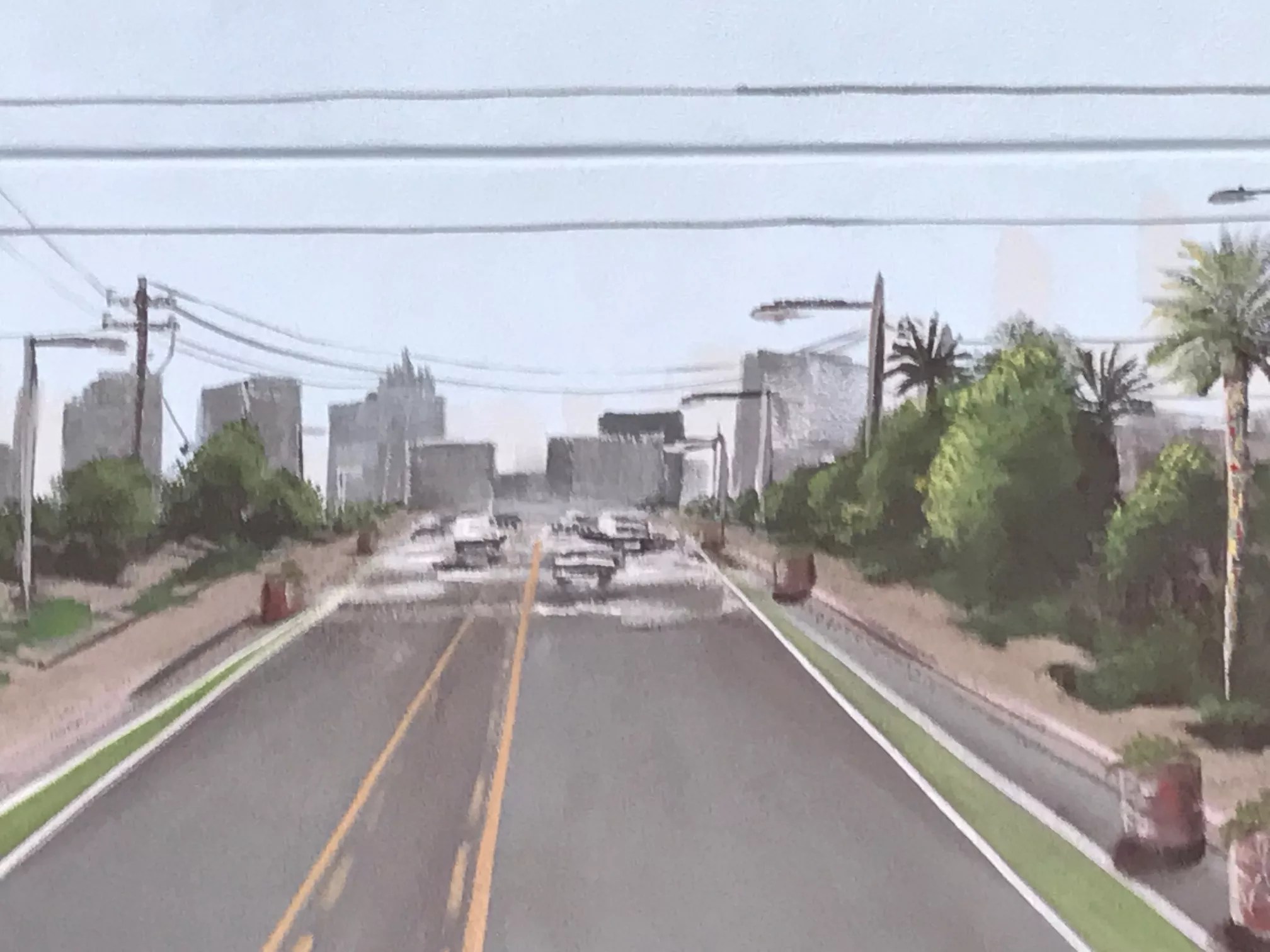 Intersections figure prominently in Best’s work, which often explores urban landscapes. Sometimes, she focuses on specific elements of the landscape, from power lines dotting desert horizons to man-made water features that function as faux waterfalls in an arid cityscape.