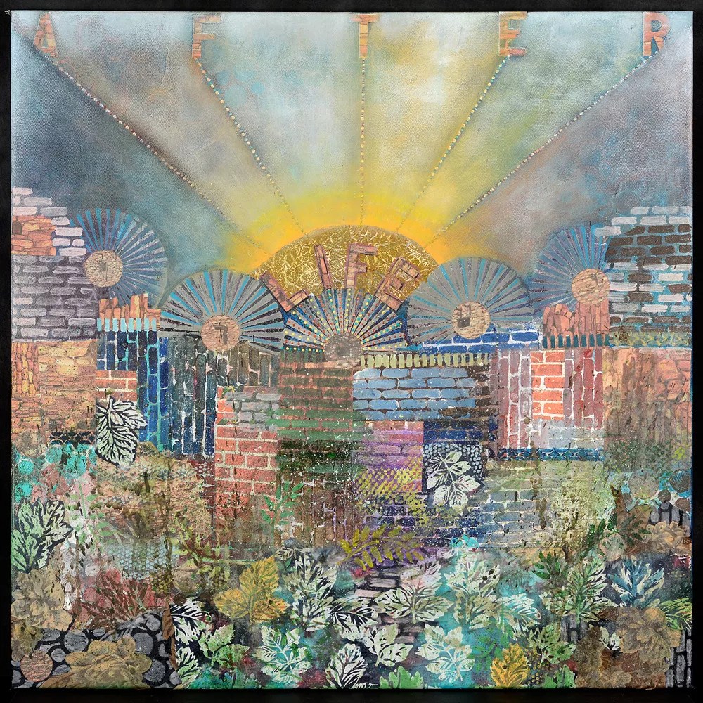 Allen uses a colorful palette, building up texture for acrylic paintings that often include collage elements created using found images.
