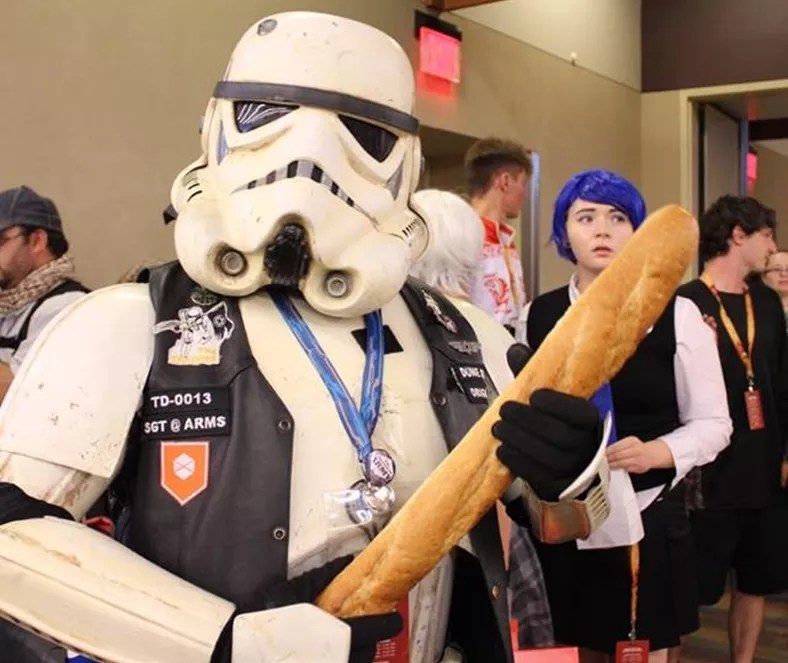 One of the highlights of this year’s Comicon was all the creative ways that cosplayers dealt with the prop weapons ban, including stormtroopers from the Dune Sea Originals using baguettes instead of blaster rifles or those with bananas for guns. Rowen says that those are both acceptable stand-ins for actual firearms. “Those are clearly props,” she says.