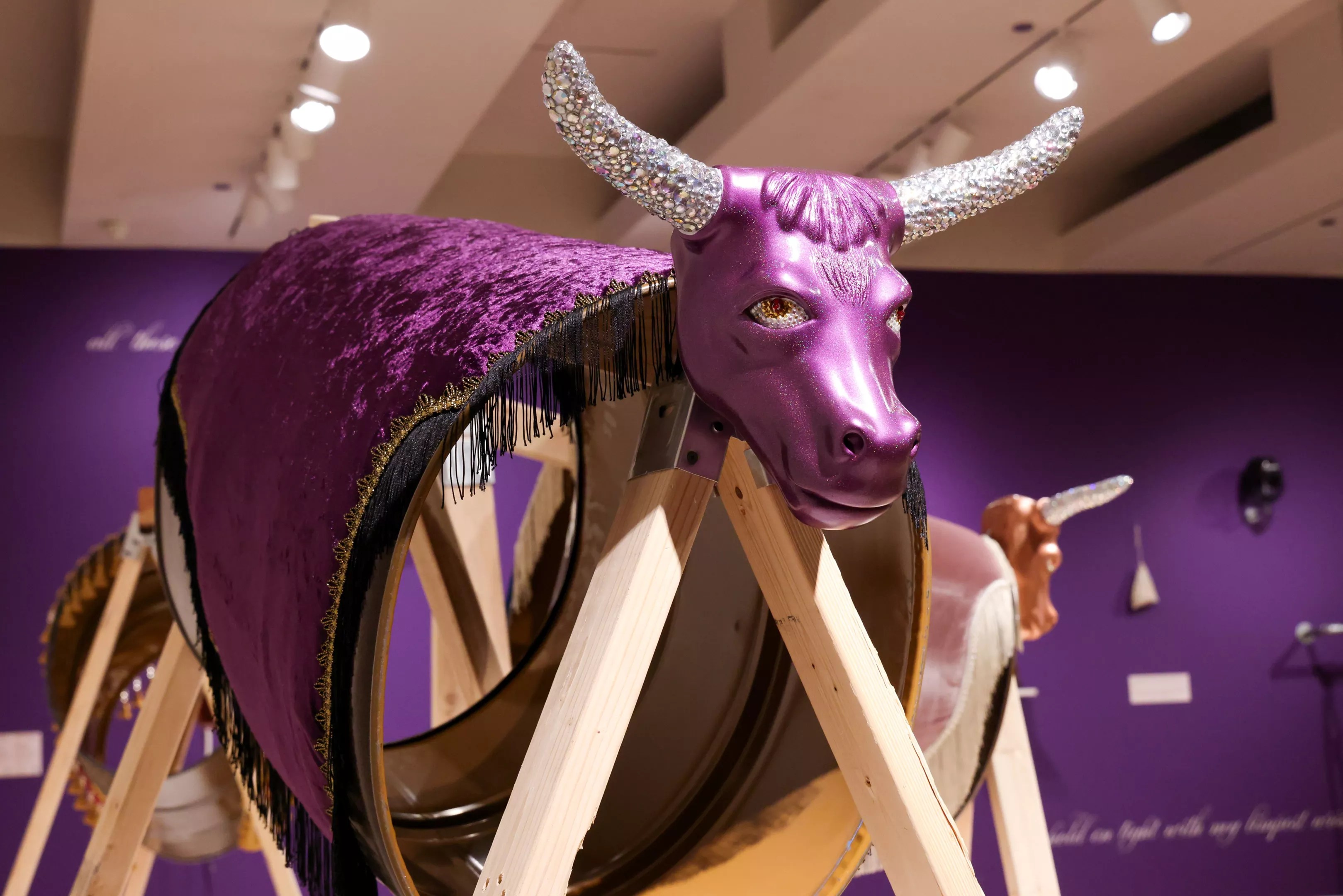 There’s a wall of objects in the show, and all those are protective gear but they are also to enhance the ride. They help to stay on the bull longer, to soften blows of impact. In this exhibition, I went into this image of the Cowboy, but it’s all spectacle. So a lot of the art is about the idea of performative masculinity.