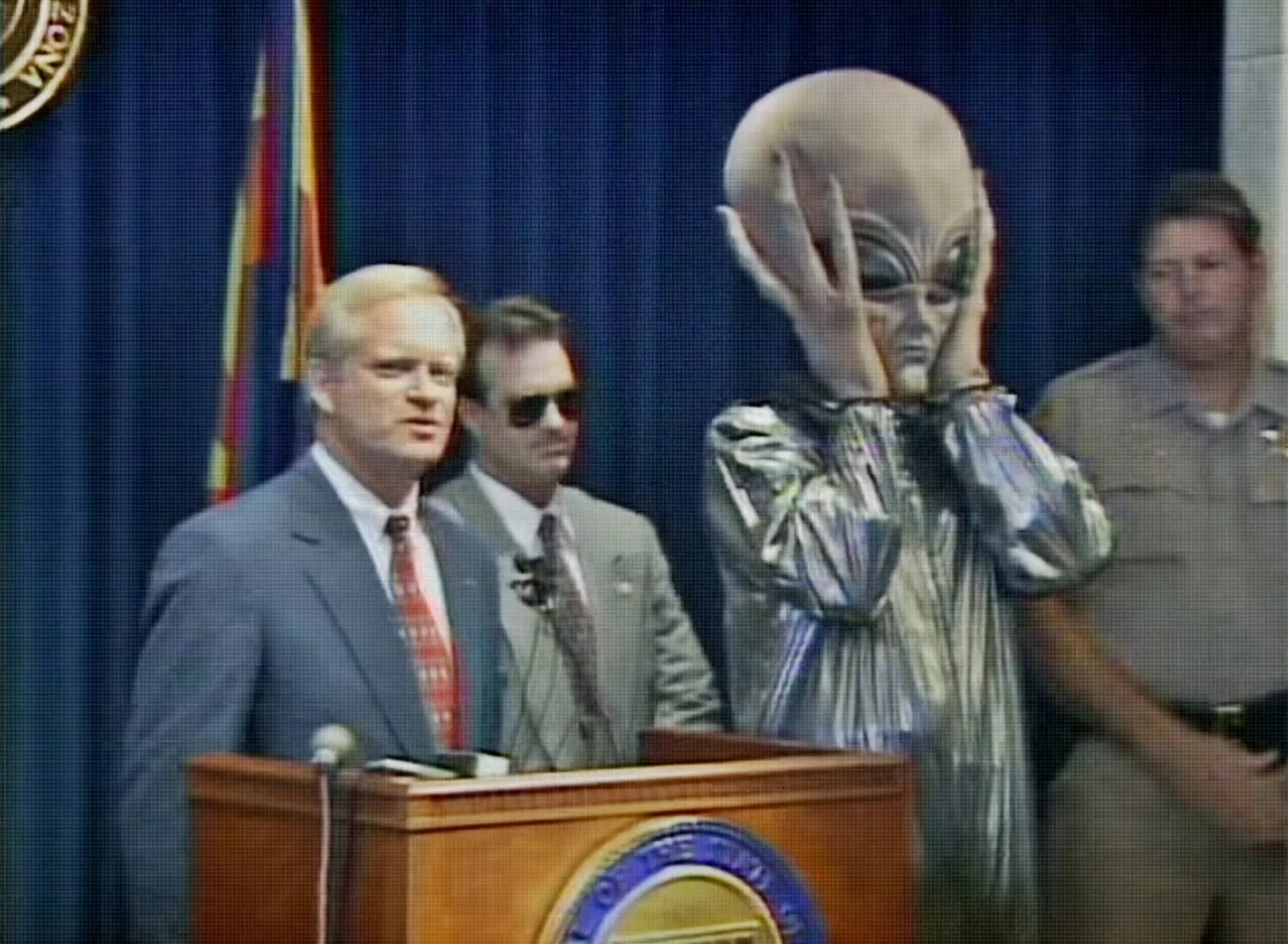 Symington’s news conference was anything but serious. After declaring state officials had found the “guilty party” behind the sightings, his chief of staff, Jay Heiler, was perp-walked to the podium dressed as a grey alien in handcuffs before unmasking. Everyone in the room had a good chuckle. Kitei and other UFOlogists didn’t appreciate the joke.