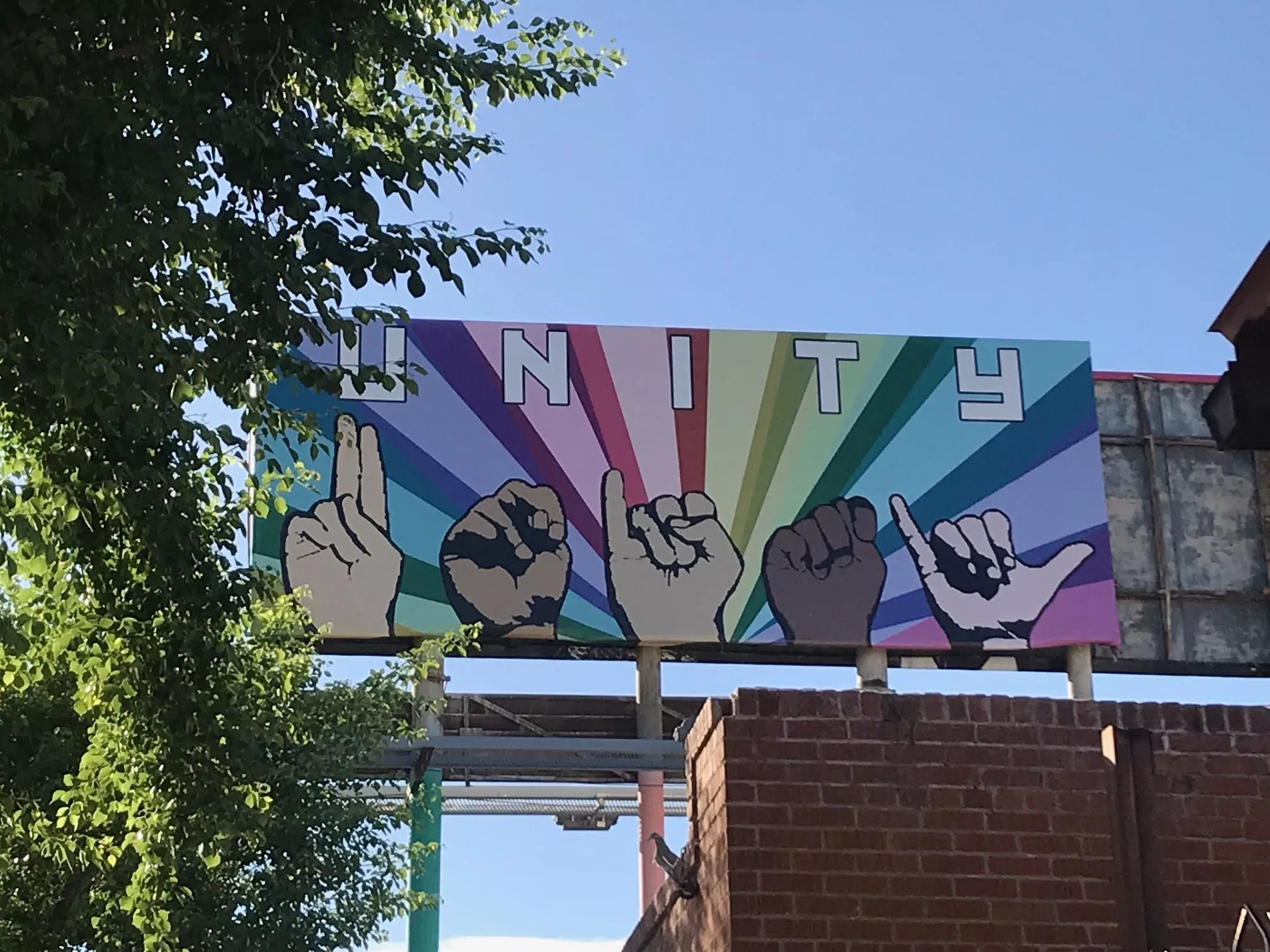 There’s a smaller panel measuring 10-by-24-feet on the back of the billboard. Three years ago, it featured a Fiorito design with five hands spelling out the word “Unity” in sign language, set against a backdrop resembling rays of sun on the Arizona flag. Later, Fiorito changed the rays to rainbow hues.