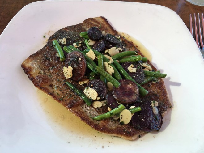 Rustic trout cooked on cast iron in a Western town.