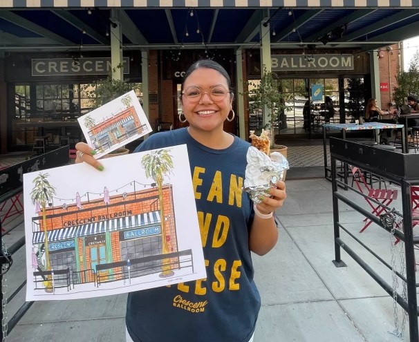 Her drawings and watercolors illustrate Phoenix landmarks like Crescent Ballroom and Grand Avenue.