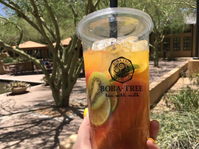 So-called ‘crazy fruit tea,’ a delicate, iced jasmine tea served in an extra-large cup stuffed with fresh slices of pineapple, orange, kiwi, strawberry, and whatever else they have on hand fruit-wise, is worth the drive to Boba Tree in Mesa.