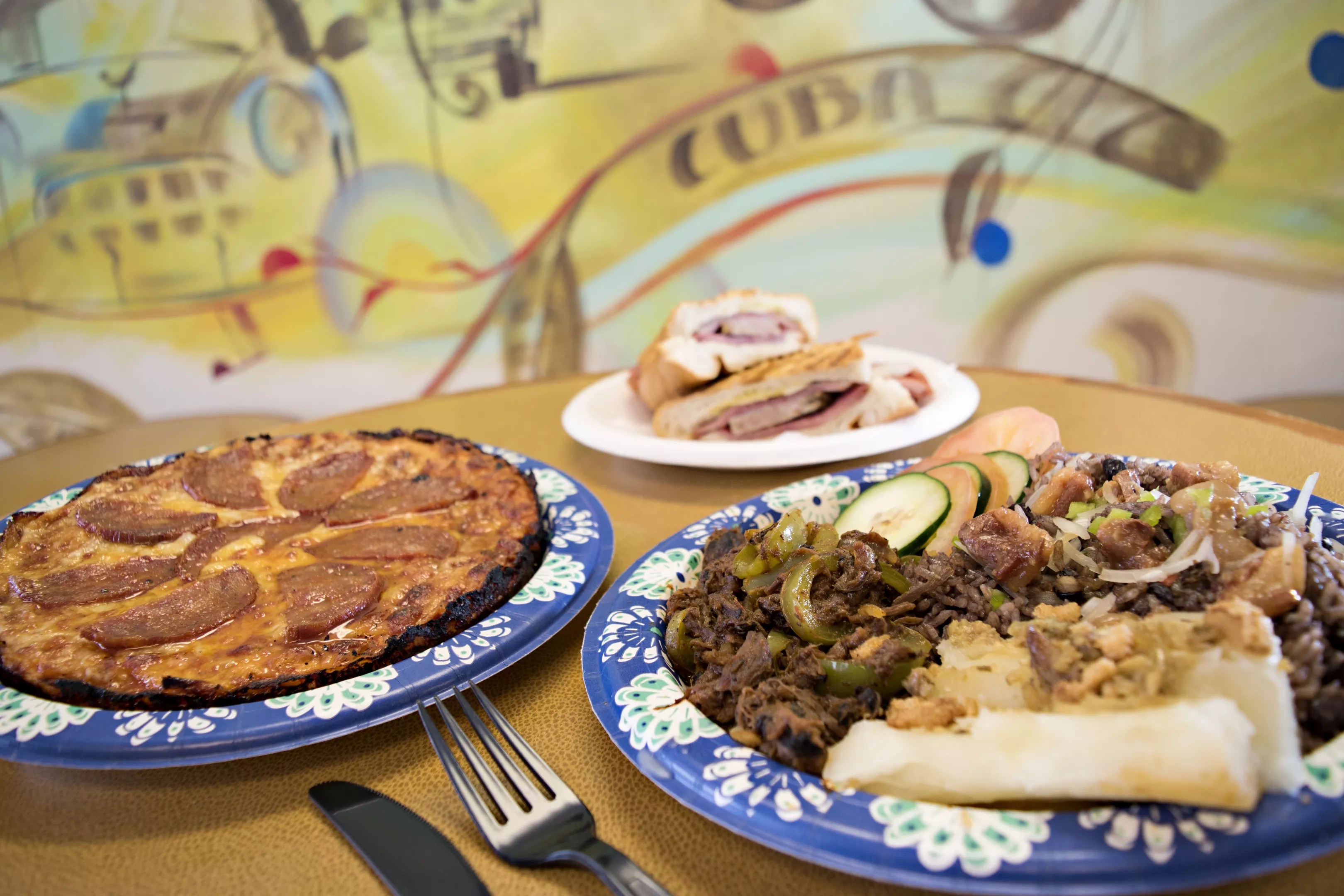 Pizza de chorizo, Cubano sandwich, and ropa vieja (right) from Edward’s