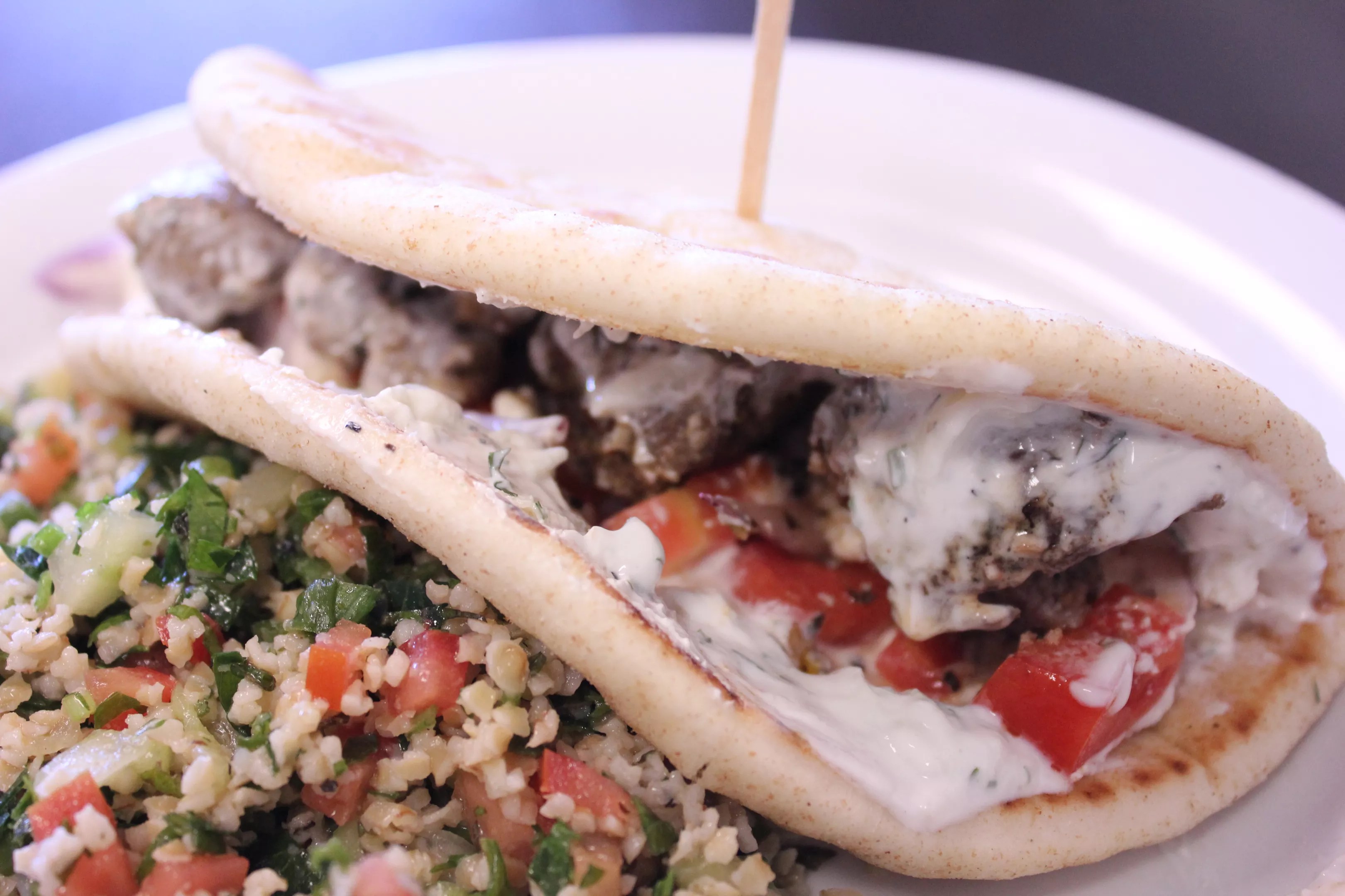 Chunks of lamb line the pita’s fold. (Or a skewer – but I went pita.) Some are so huge that you’ve got to tackle them in two bites. They have fattiness and good chew, and a nutty, wild aroma tells you, each time you bite in, that you’re in a zone way apart from chicken or beef. You get even more soft, oozing textures from the tzatziki and feta, hot richness anchored by scant tomatoes and onions.