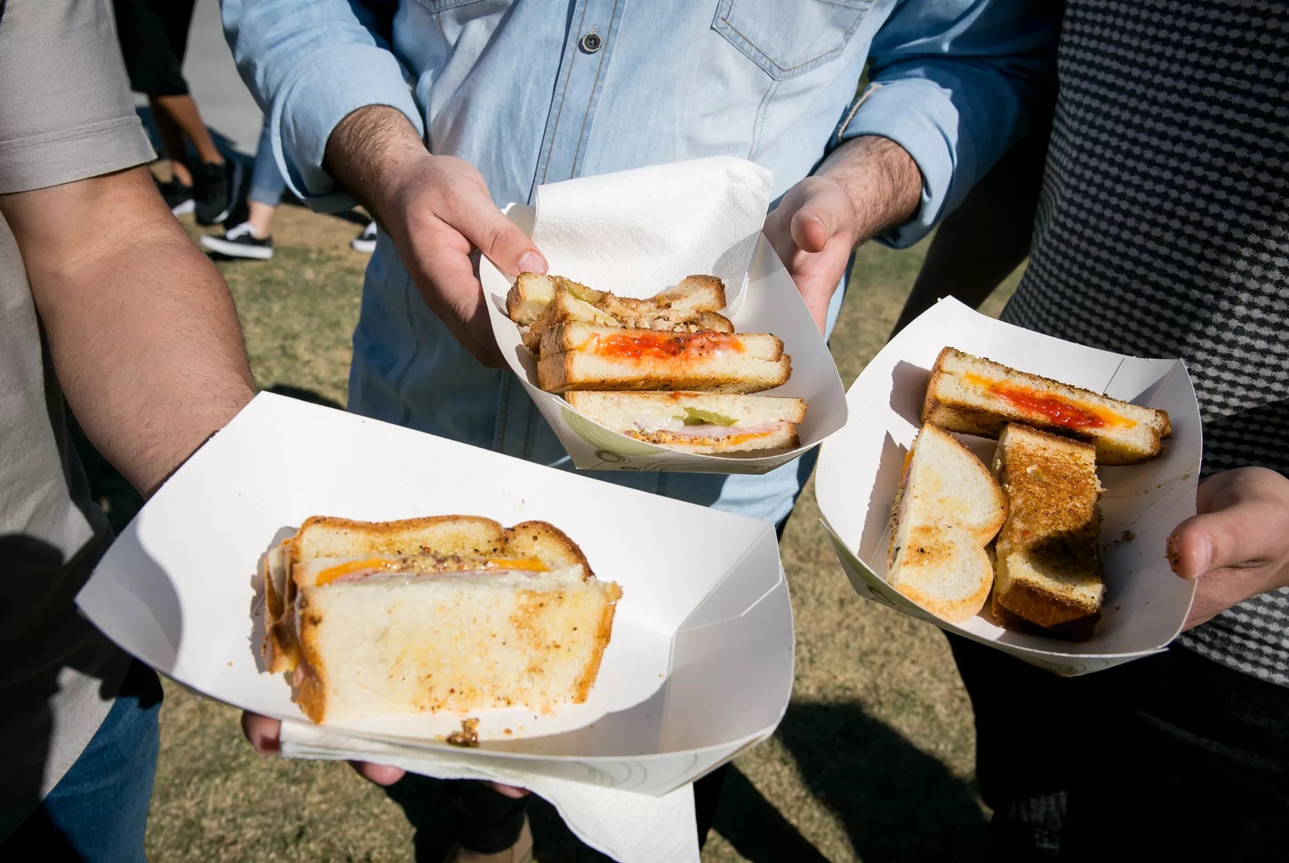 A trio of sandwiches from 2 Fat Guys Grilled Cheese.