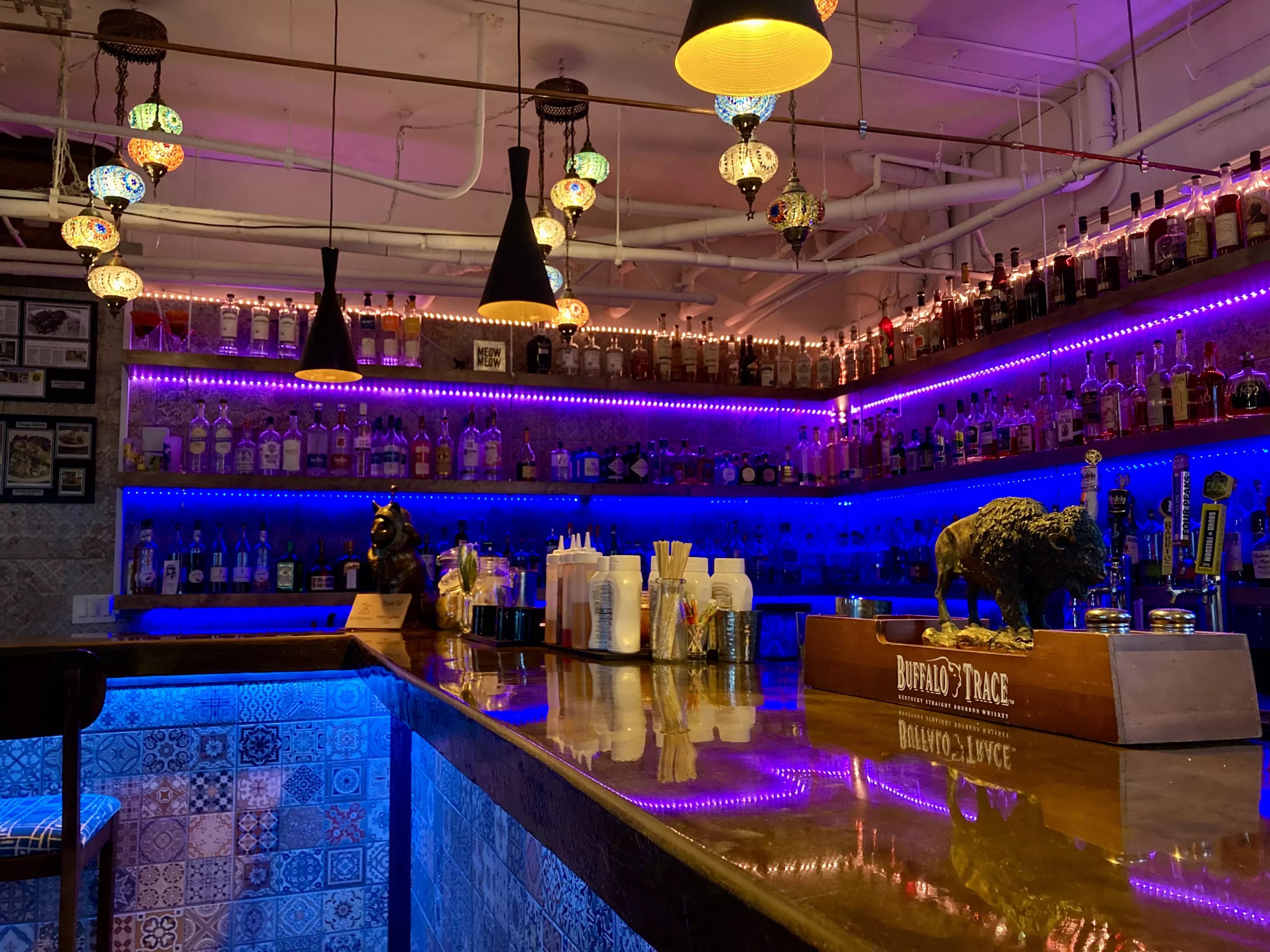 This colorful bar, found by entering The Clarendon lobby and hooking right, is an ideal happy hour spot for visitors and a day drinker’s paradise for guests. The space offers a lounge area with seating, a moody bar area adorned in colorful tiles and light fixtures, a sunny dining room, and a backyard garden-like patio. Jeff Ward’s Fuego Bistro offers Latin-infused food alongside margaritas, mojitos, and mules, as well as sangria and umbrella cocktails. Happy hour is 3 to 6 p.m. daily.