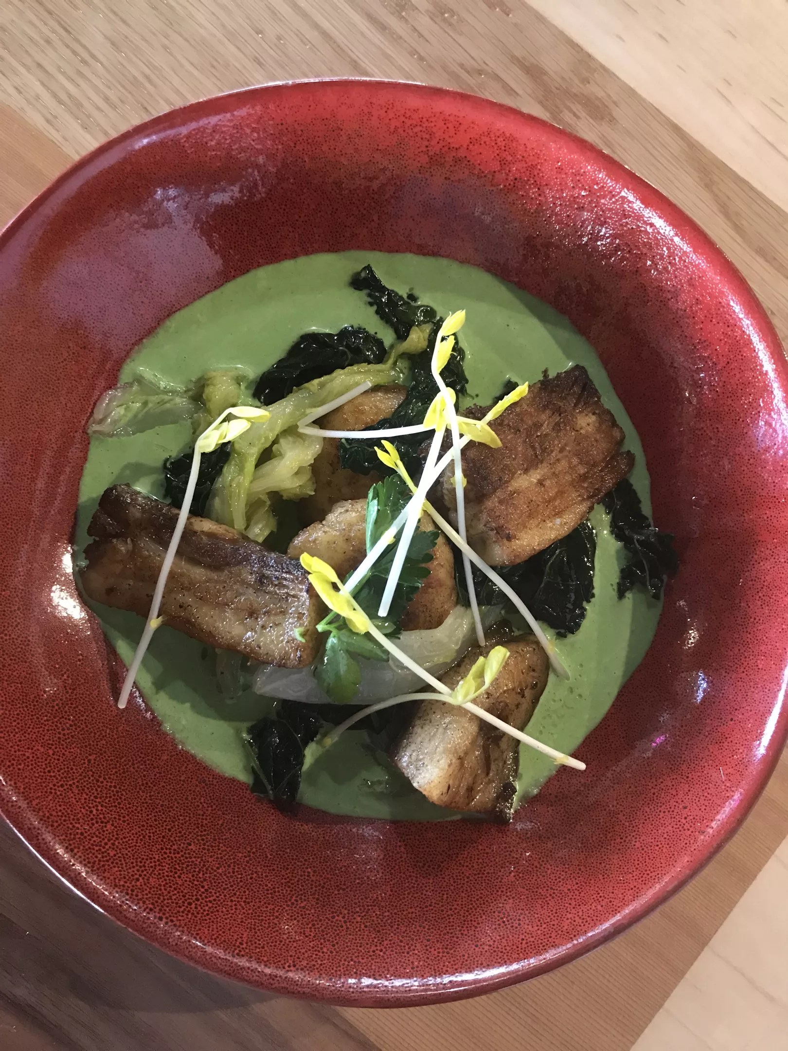 The potato dumplings with Savoy cabbage, corned beef, and kelly green sauce at Match Restaurant & Cocktails.