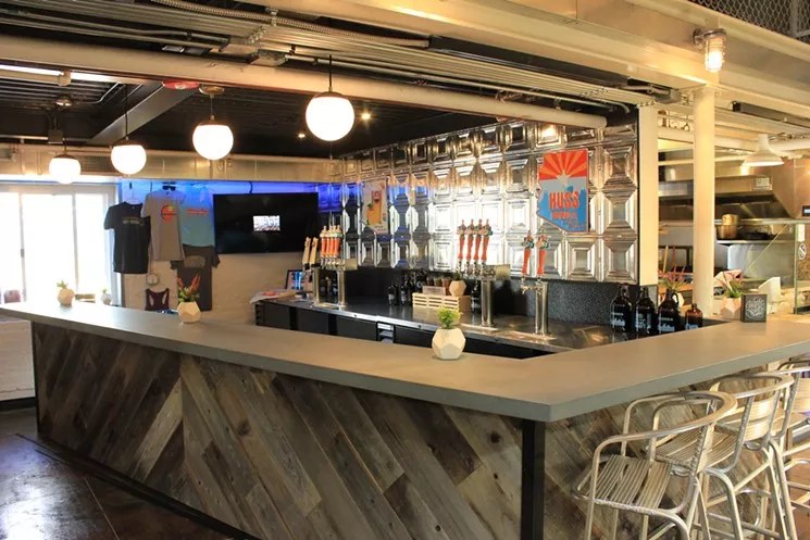Huss Brewing Company is the current pop-up brewery at DeSoto Central Market, the Phoenix food hall that started a pop-up residence in January. Every three months, a new brewery will rotate into a market storefront and hook kegs up to taps. The market’s liquor license extends to the whole property, meaning that you can take your beer to dining tables across the room or out to the patio. Huss Owners Leah and Jeff Huss set up 12 taps in the DeSoto space. They are pouring favorites like Coffee Kolsch and Scottsdale Blonde as well as specialty brews specific to the pop-up (chocolate-raspberry Coffee Kolsch). Marketgoers will be pleased to have what is essentially a full tap room in one of the coolest places to eat in town. Nothing like a cold brew to go with a patio game of cornhole and fresh oysters, steamed buns, or a fried chicken sandwich.