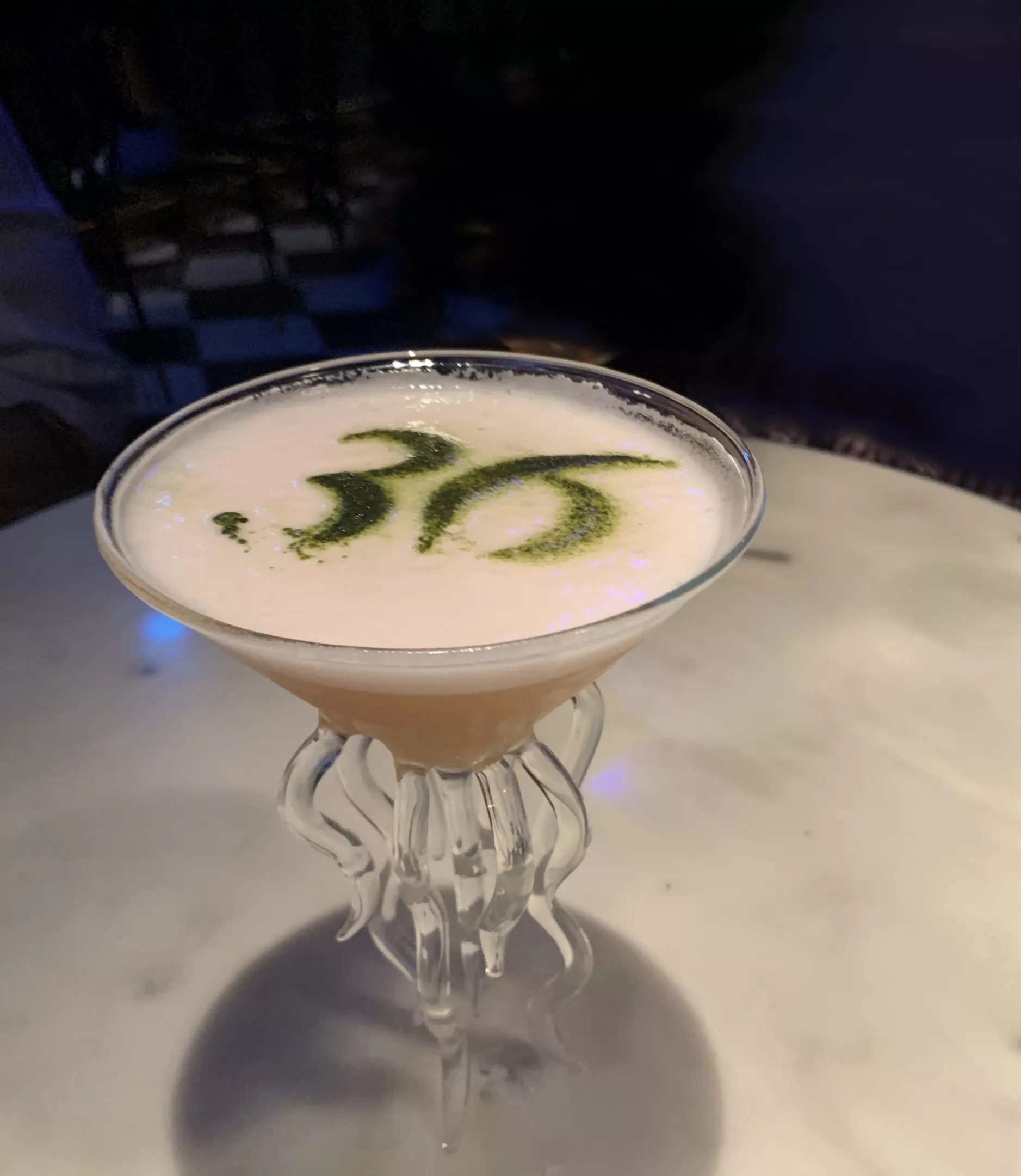 -Genesis, a vodka martini, arrived in a martini glass with tentacles and “36” inscribed on its surface in matcha powder. Refreshing and peach-forward, it had a faint lychee flavor. The matcha gave the last few sips a perfectly earthy finish.