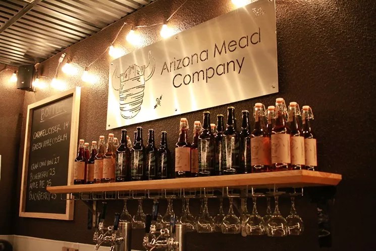At Arizona Mead Company, mead is served chilled from the bottle. Ciders and cysers are dispensed from four rotating taps. “I started doing this on the side,” says Cody Brown, the man behind the operation. Now, he’s a full-time mead master, owner, and bartender at Arizona Mead Company. Brown lets his mead ferment an average of six months. This is a long fermentation. He has gone even longer, letting some meads ferment for over a year. How does he know when a mead is ready? It’s ready when it tastes good, he says. Meads currently fermenting include bourbon-barrel-aged traditional meads (just honey), a guava-berry mead, a strawberry mead, and a raspberry. Brown is prepping ingredients for a second batch of pumpkin-pie mead and coffee-chocolate mead, both of which will be ready this fall.