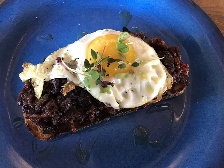 Tea & Toast operates to the right of the broad staircase to the second level of DeSoto Market, the under-appreciated food hall at Central Avenue and Roosevelt Street in Phoenix. Here, tea comes loose-leaf, and toast uses Noble bread. There are hot tea options and a handful of iced teas that are infused with flavors like raspberry and mint. Tea & Toast also offers frothy tea-based creations that usually belong to coffee’s domain. A green tea latte. A black tea cappuccino.Toast options are good for a quick breakfast. Yes, there’s standard avocado toast, but also toast that features mashed banana, chocolate, and toasted hazelnut. Another, ricotta and melon. The most decadent toast is the slice spread with bacon jam and mounded with chopped bacon, a lacy fried egg quivering on top. This one is direct journey to the heart of umami and will bludgeon your appetite in a single piece. It’s not a bad way to start a big day.