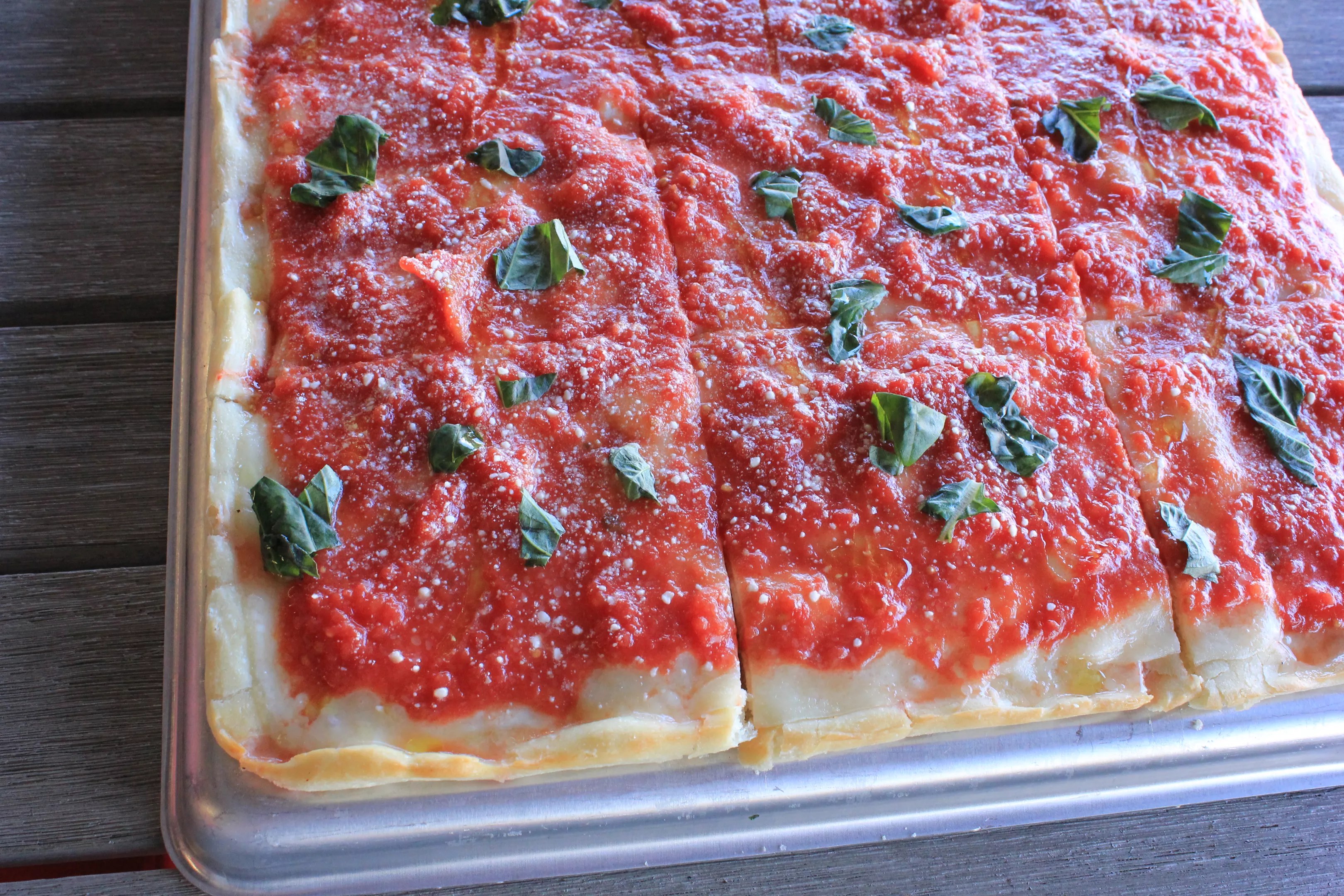 Langu’s grandma pizza is a thick-crust pizza style. Notable entries in this category include Sicilian (very thick), Roman al taglio (not quite as thick; cut with scissors; the Eternal City’s most popular slice), Detroit-style pizza (often made with Wisconsin cheese; enjoying a U.S. moment right now), and tomato pie (bread dough topped with sauce; popular in Philly and South Jersey). Grandma pie is pizza baked simply in a sheet pan the way you might make pizza at home.