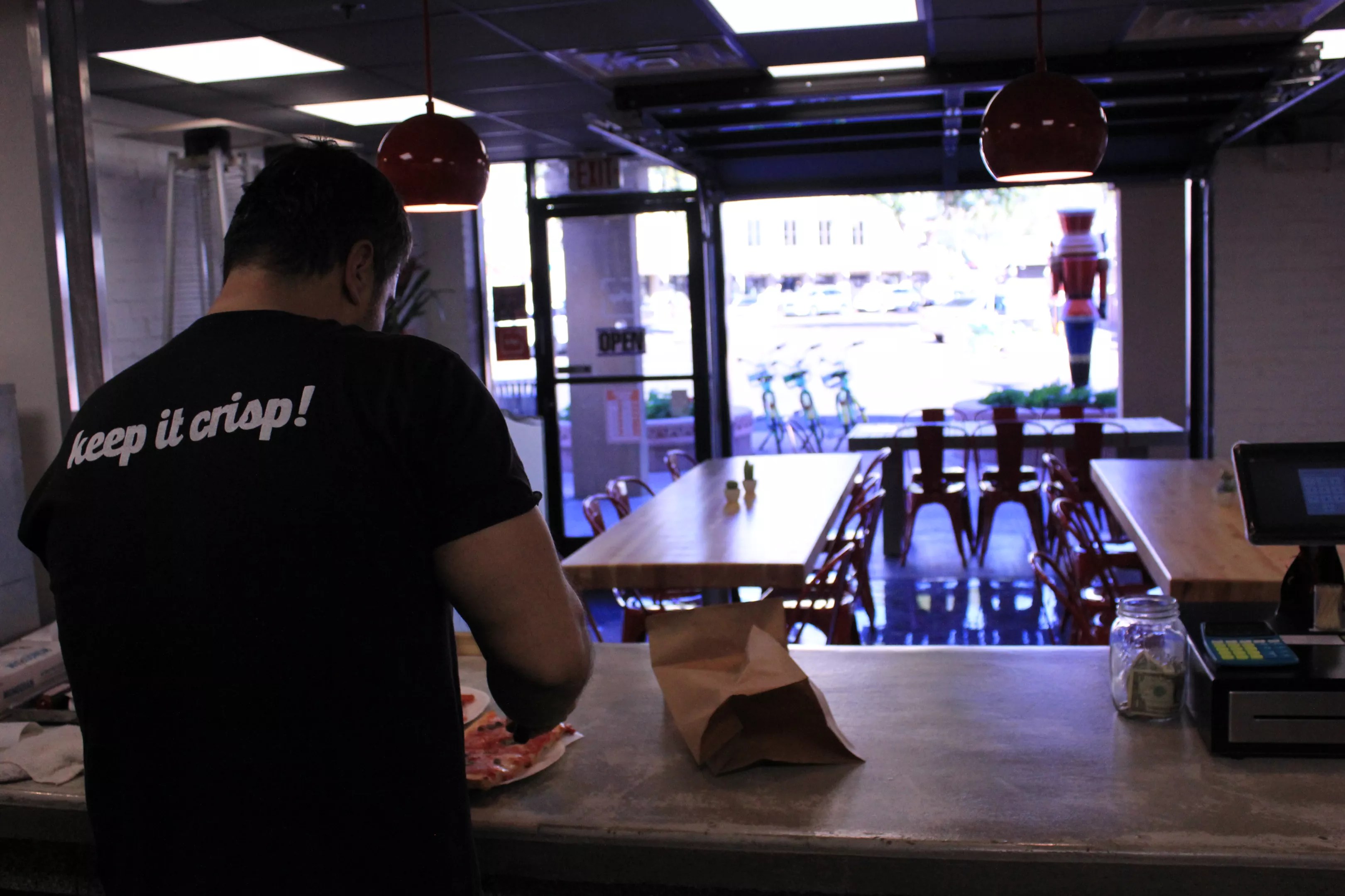 Langu doesn’t crank his gas-fired oven much higher than 500 degrees. His thicker pizzas take a little more time, and he’s only one guy. Though his shop is sleek (and red, white, and brown – pizza colors), this isn’t a place you go expecting sterling white-glove service, simply because Langu is doing so much. Langu, though, does like to chat with customers.